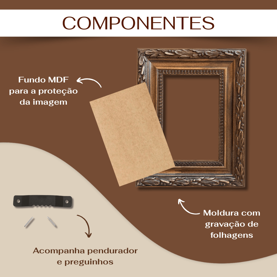 Material: Moldura em madeira pinus com gravação em gesso e fundo em mdf 3mm (não acompanha proteção para a imagem);