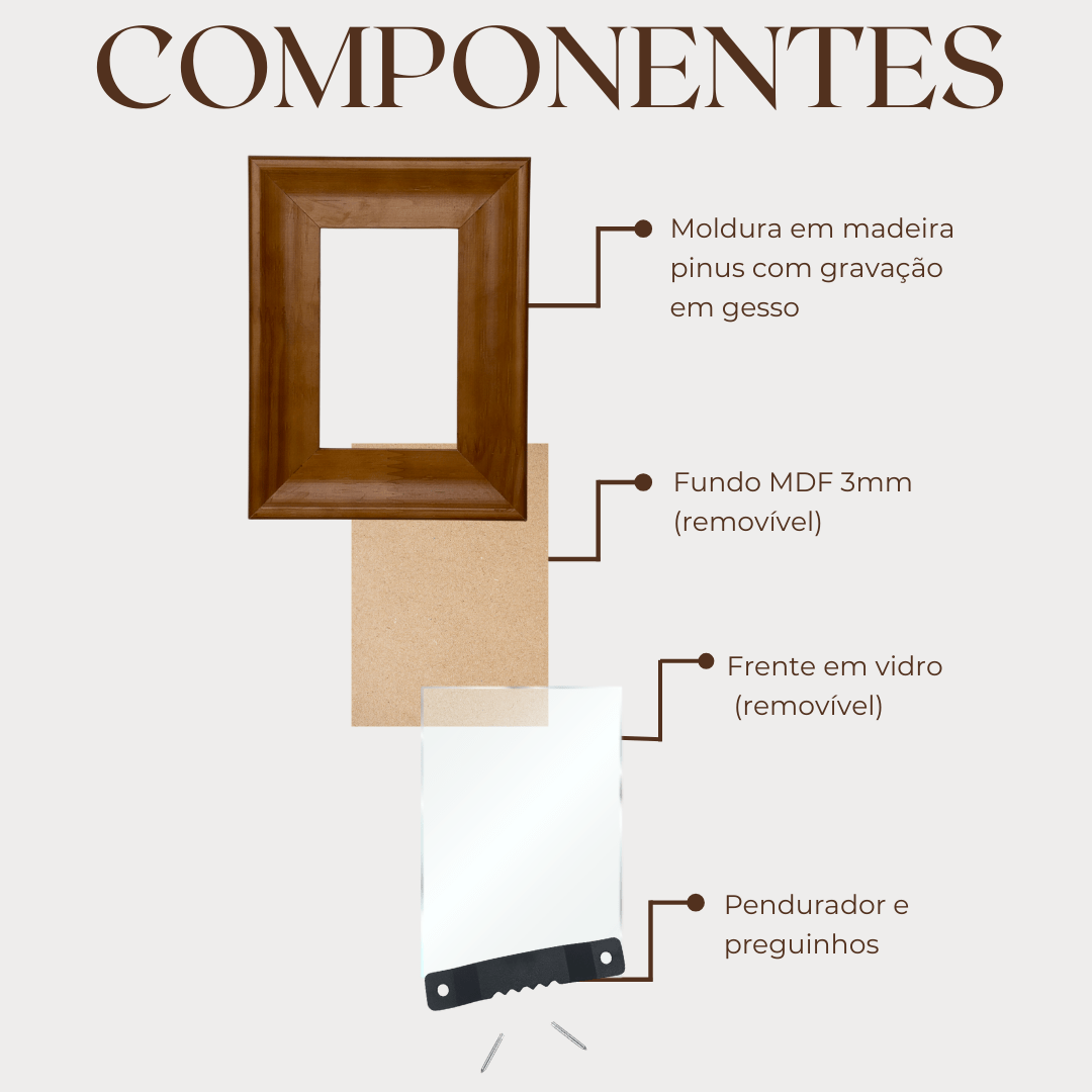 Material: Moldura em madeira pinus envernizada, fundo MDF 3mm e frente em vidro para proteção da imagem;