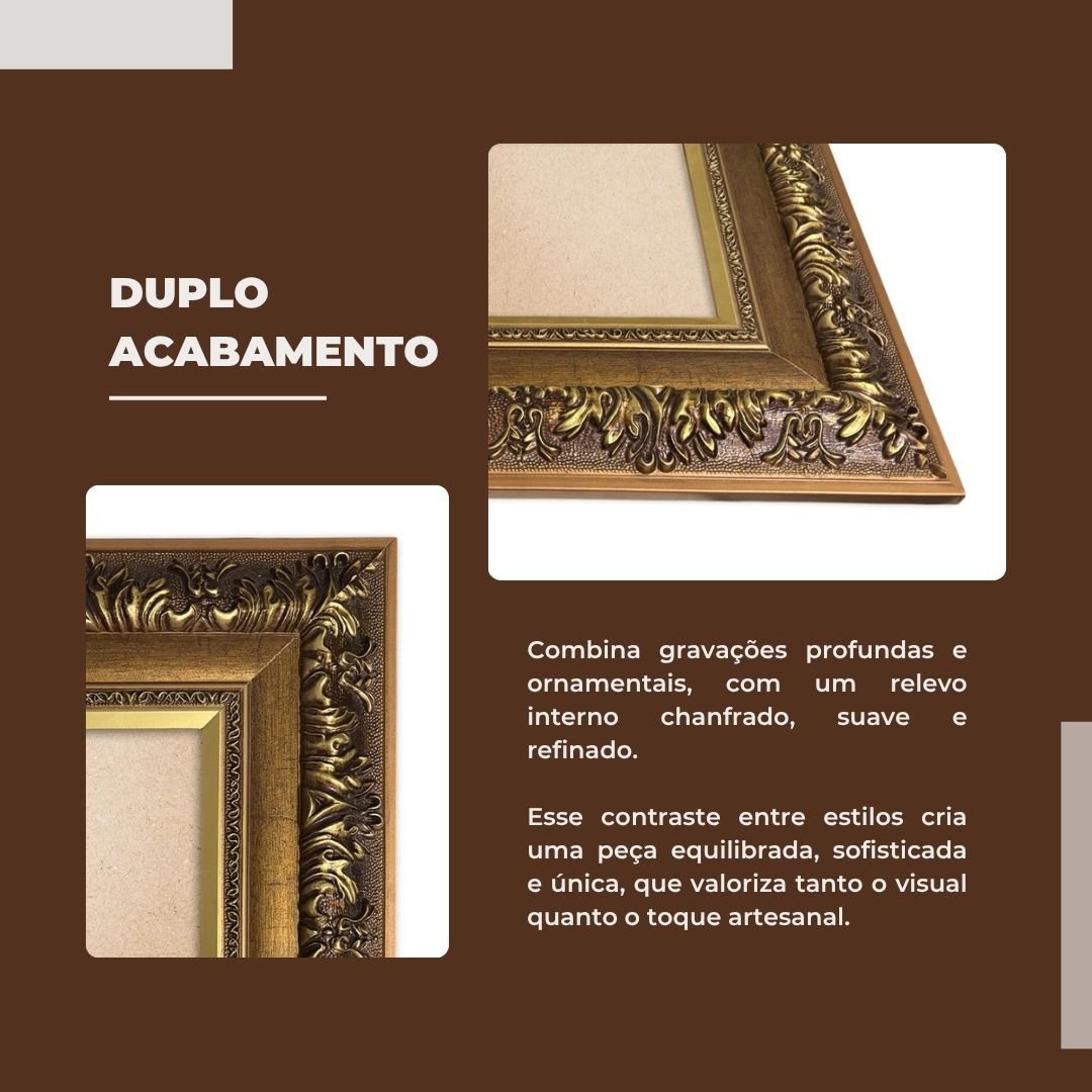O perfil interno liso e chanfrado cria uma transição sutil e harmoniosa para a peça central, guiando o olhar com leveza. Já o perfil externo, com gravação ornamental minuciosamente trabalhada, remete aos detalhes arquitetônicos dos palácios europeus. O efeito metálico aplicado com acabamento artístico dá à moldura um brilho sutil, luxuoso, que muda levemente conforme a luz do ambiente um toque de sofisticação viva, que encanta sem exageros.