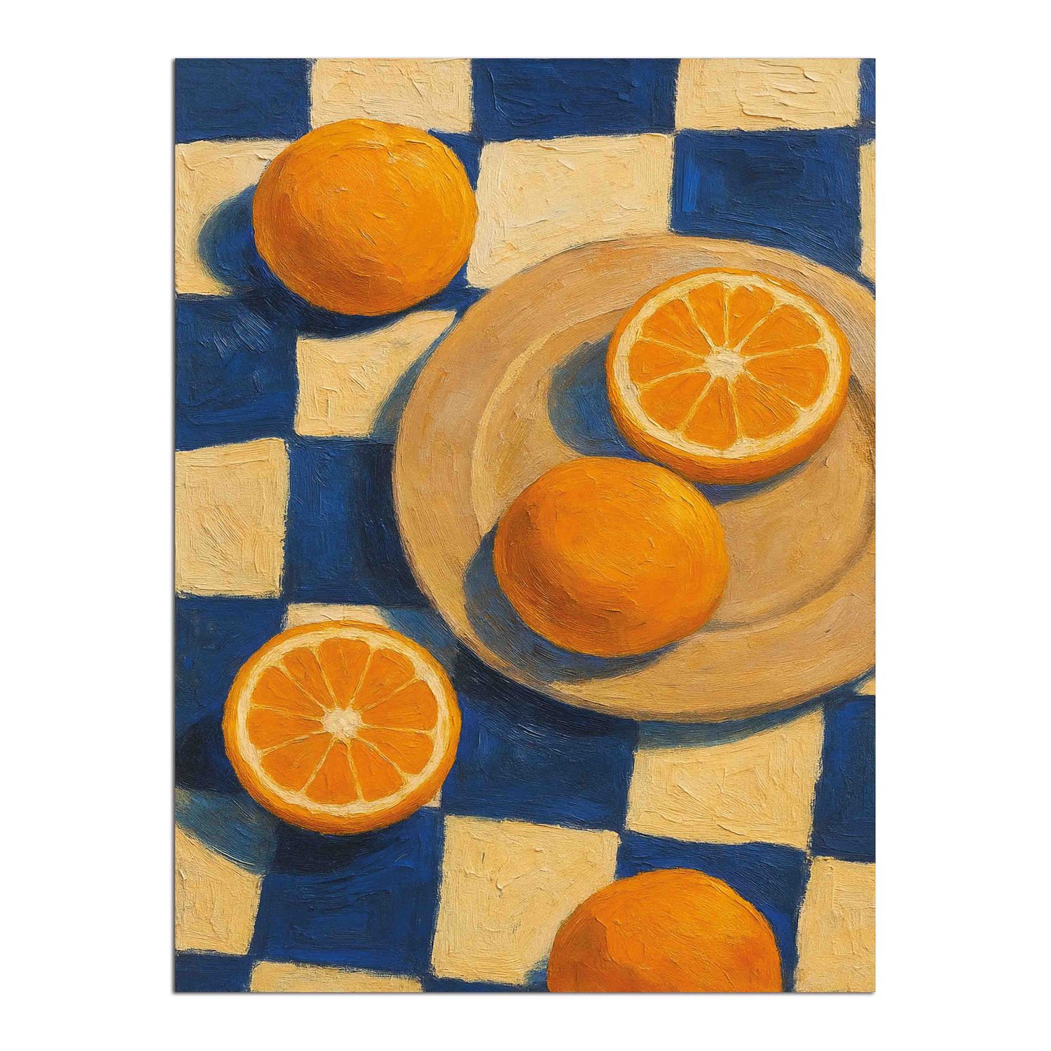 Placa Decorativa Estilo Pintura Mid Century Composição de Laranjas no Prato e sobre o Fundo Xadrez Azul