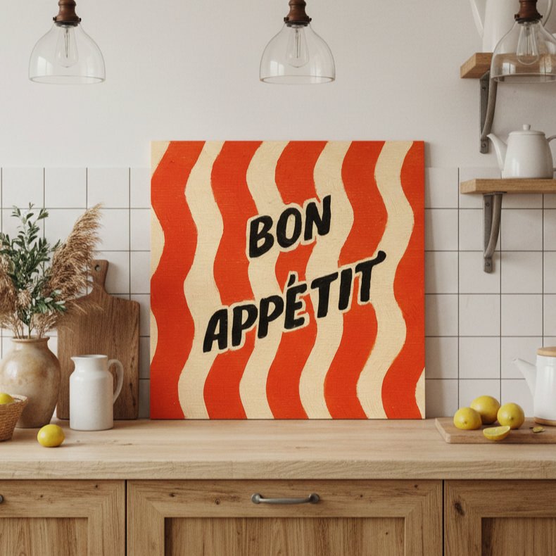 Placa Decorativa Estilo Pintura Retrô Pop "Bon Appétit" em Fundo de Ondas Vermelhas e Creme com Textura de Pinceladas