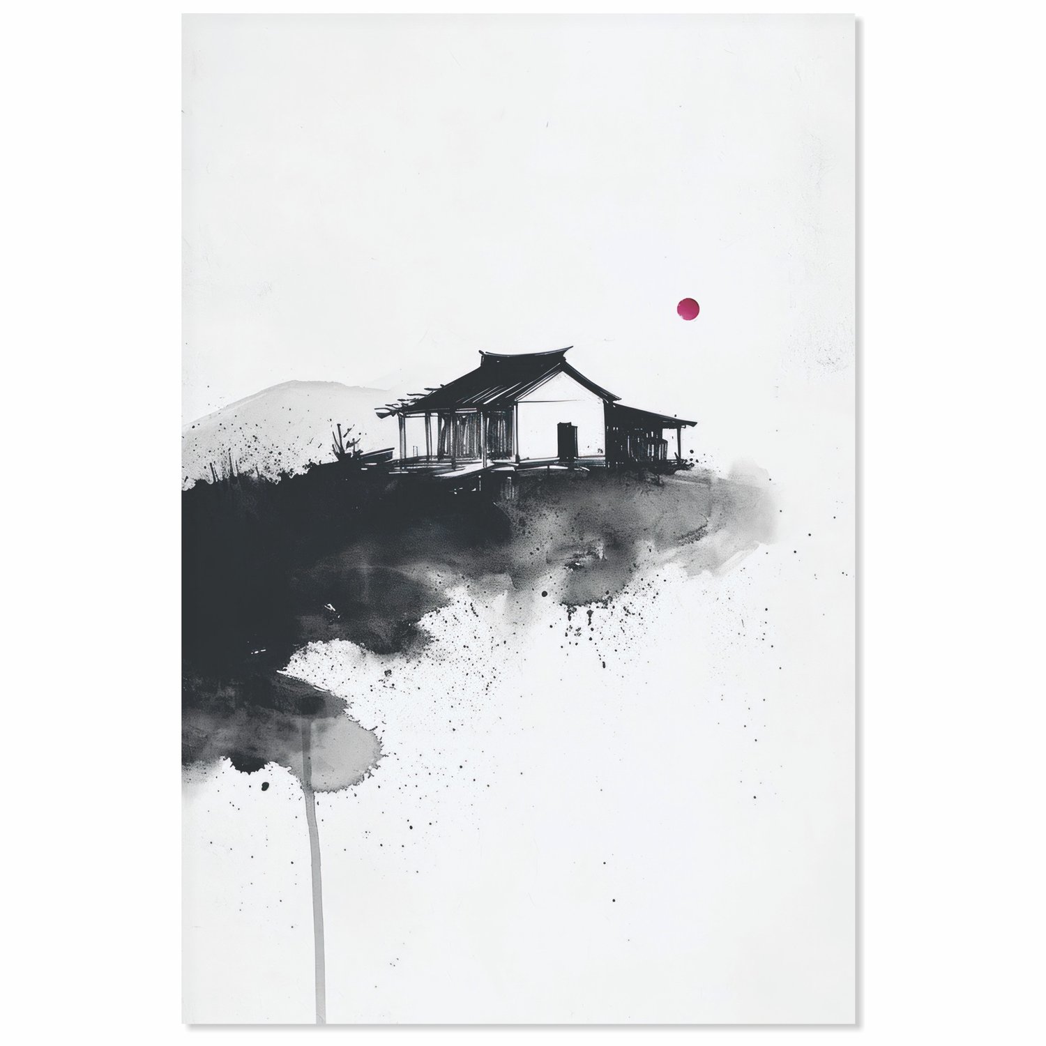 Placa Decorativa Ie Taiyo Pintura de Casa com o Sol ao fundo no Estilo Sumiê