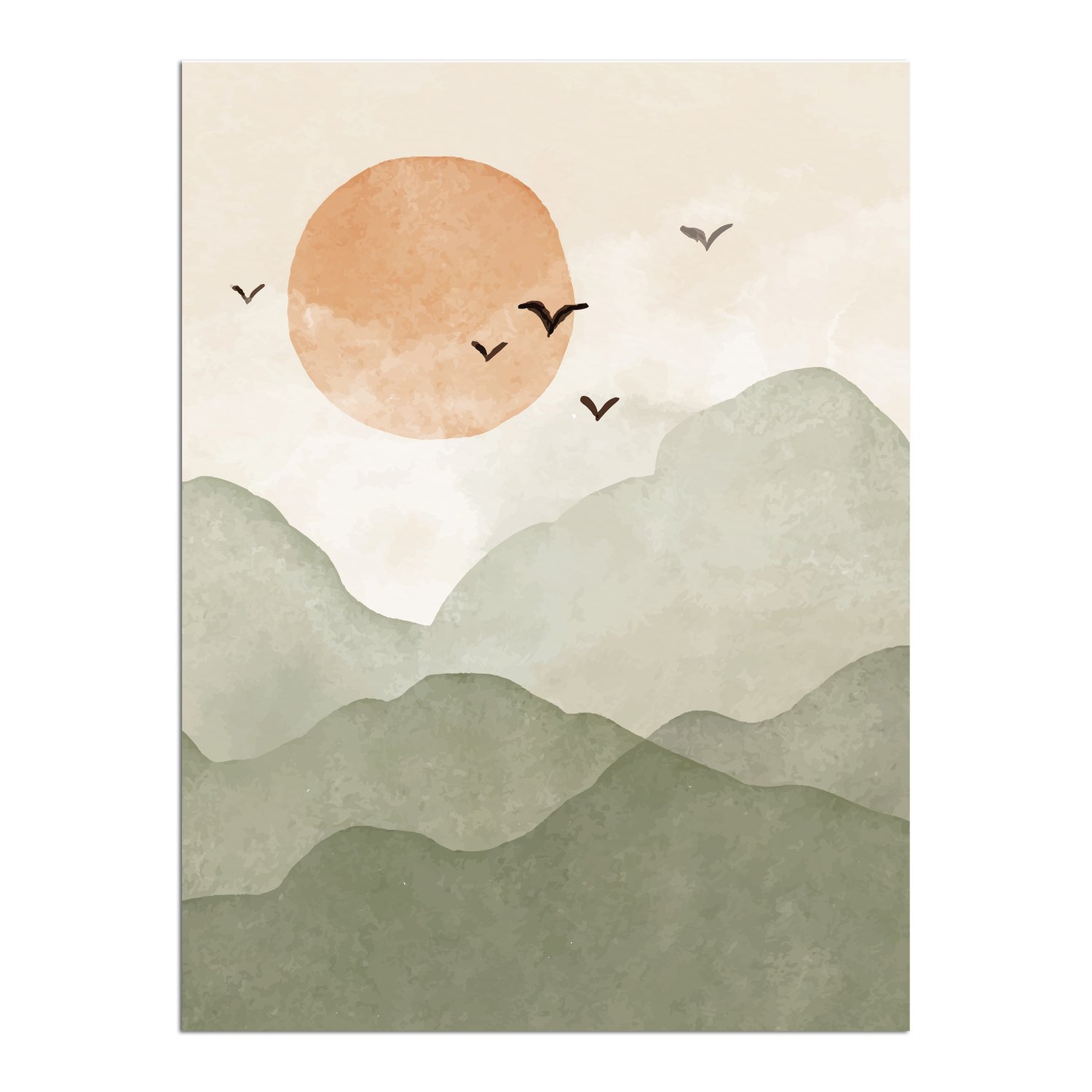 Placa Decorativa Montanhas Com Sol E Pássaros Aquarela Estilo Japandi