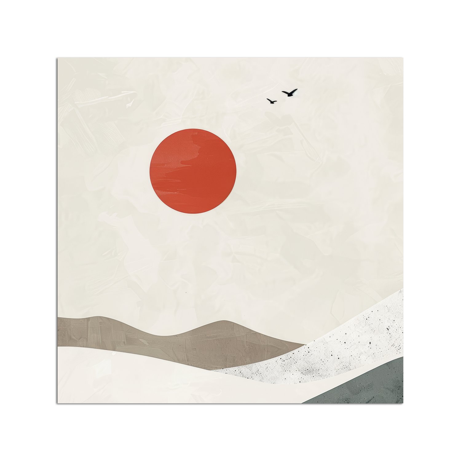 Placa Decorativa Montanhas Com Sol Vermelho Estilo Japandi