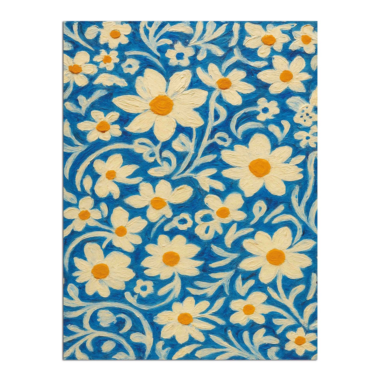 Placa Decorativa Padrão Floral Estilizado: Margaridas Brancas e Amarelas em Fundo de Arabescos Azul-Cobalto