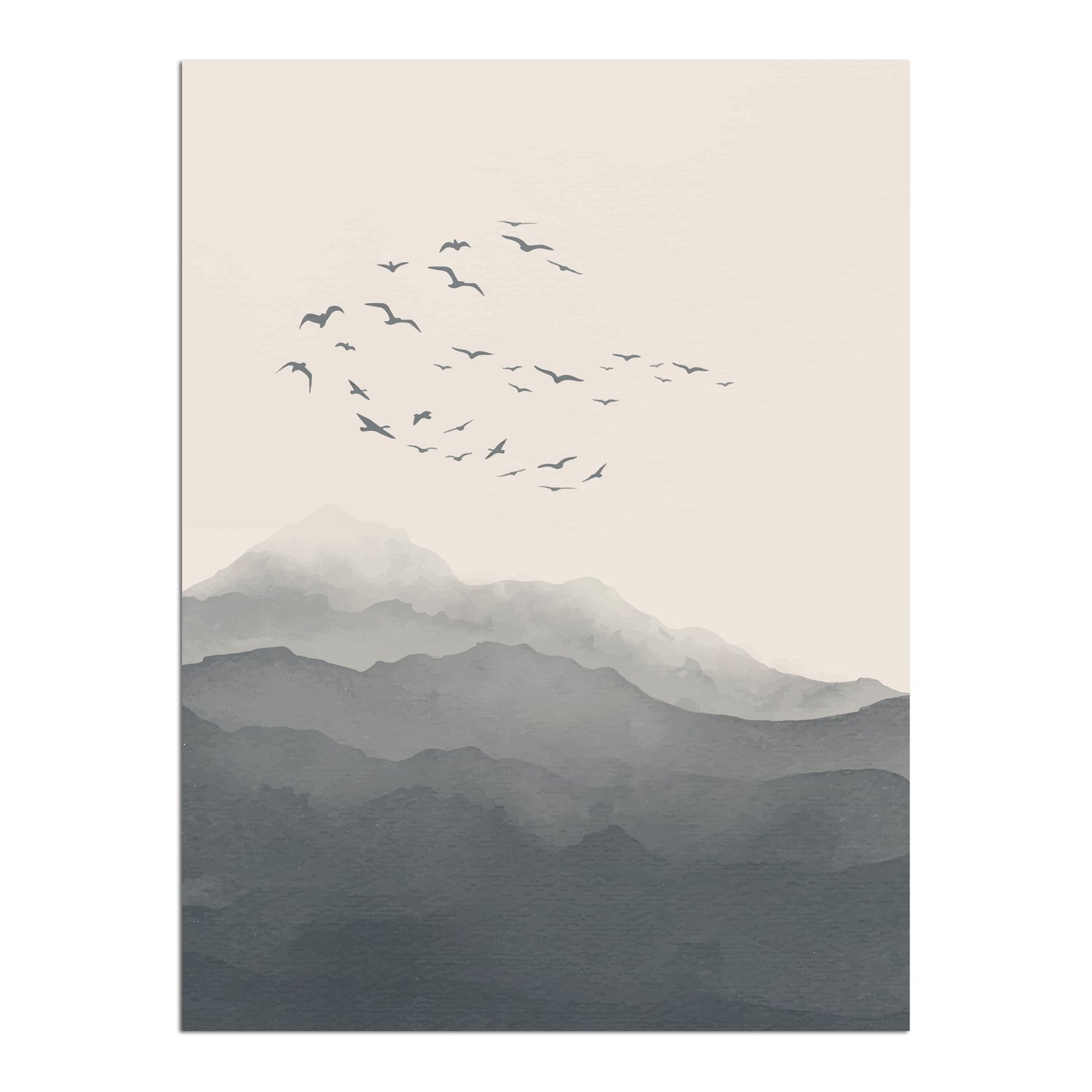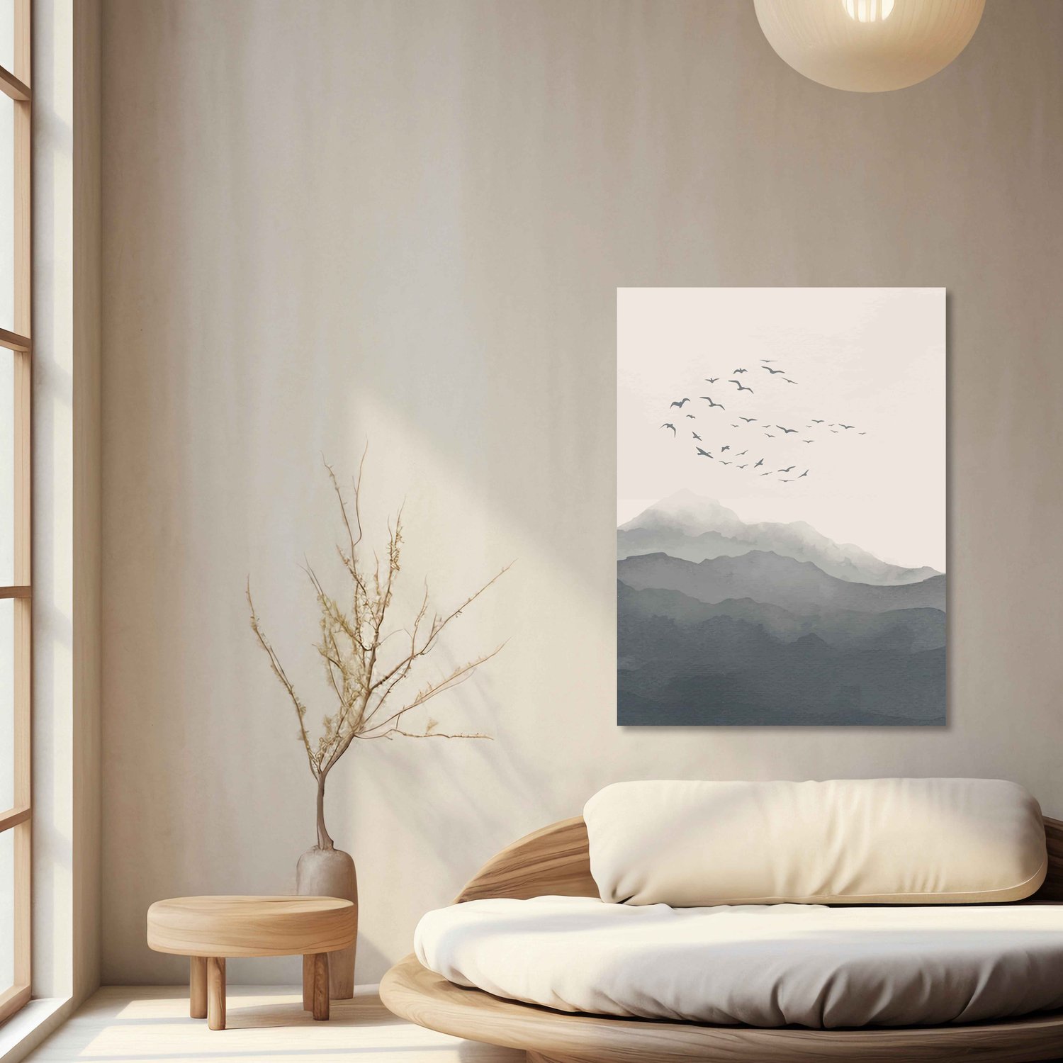 Placa Decorativa Paisagem Aquarela Pássaros Nas Montanhas Estilo Japandi