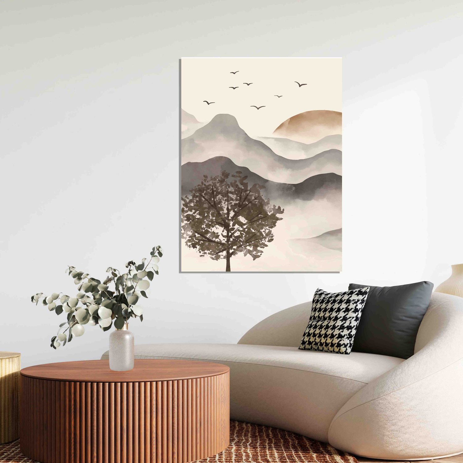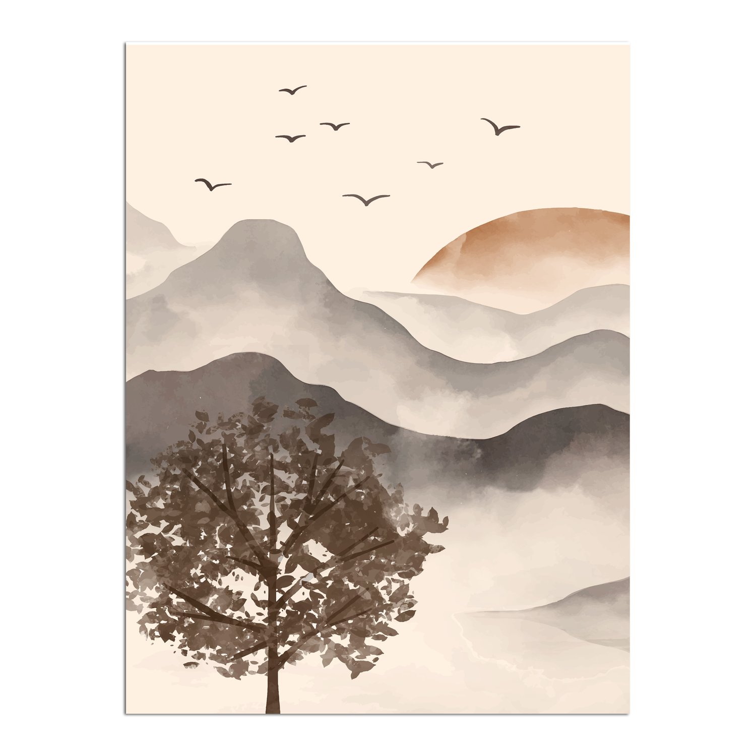 Placa Decorativa Paisagem Em Aquarela Pôr Do Sol Estilo Japandi
