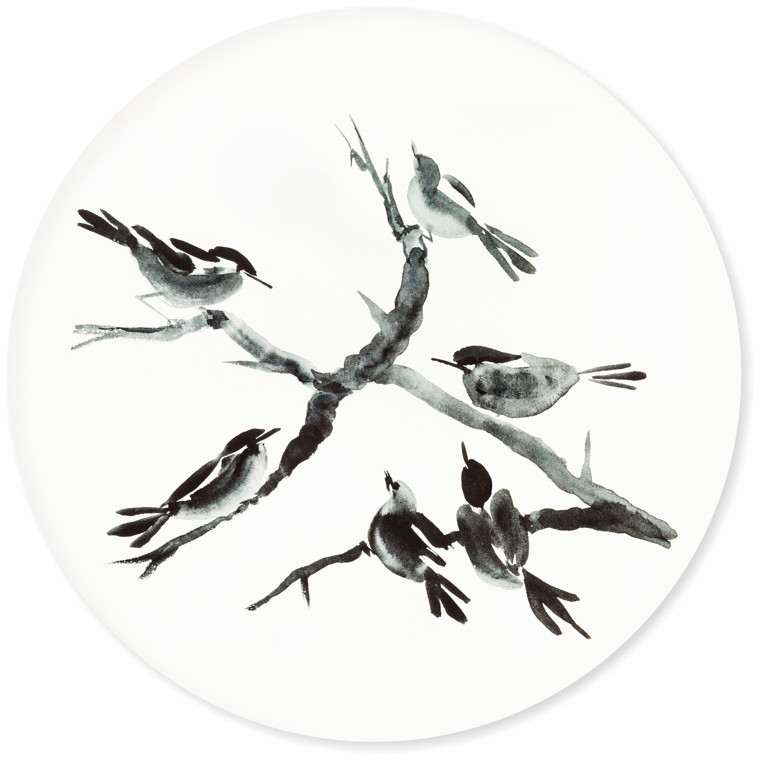 Placa Decorativa Redonda Suzume Pintura de Pardais Pousados em galho no Estilo Sumiê