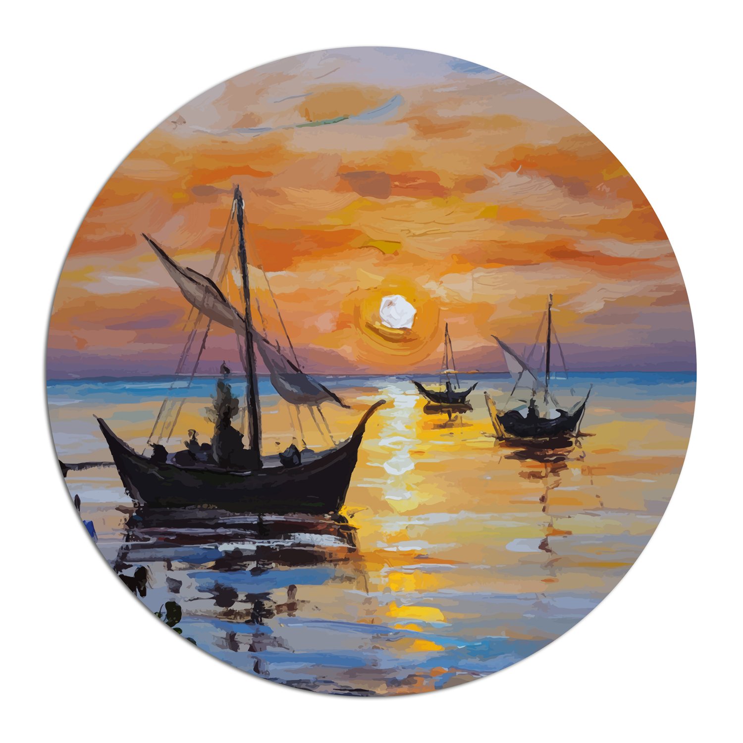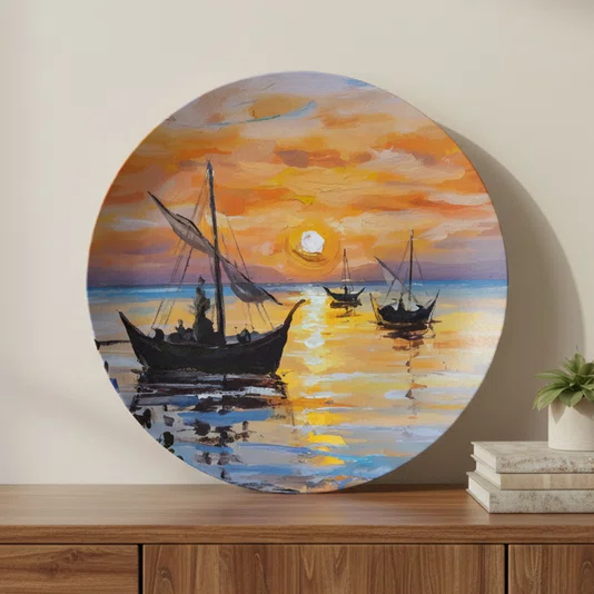 Placa Decorativa Redonda Veleiros no Mar Dourado