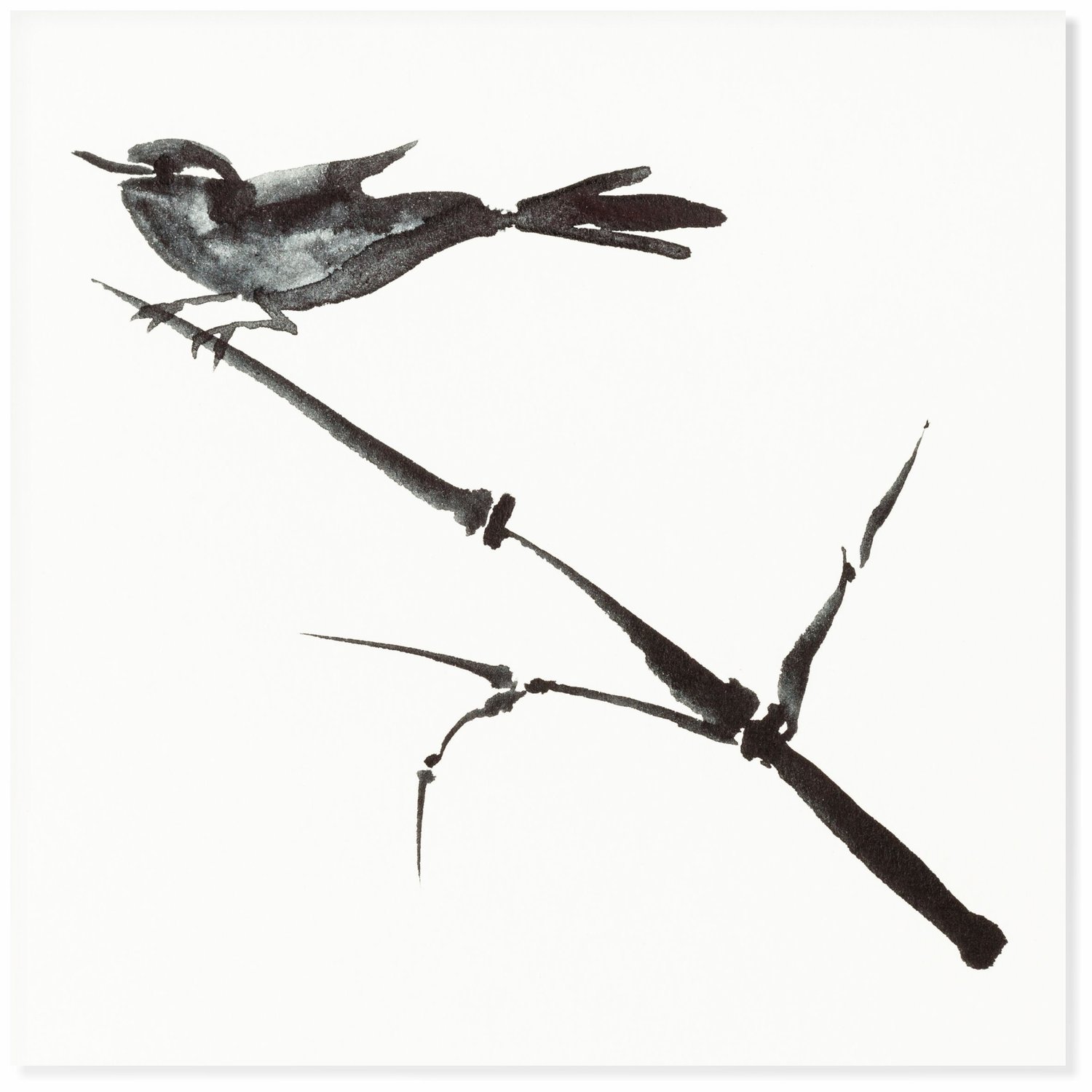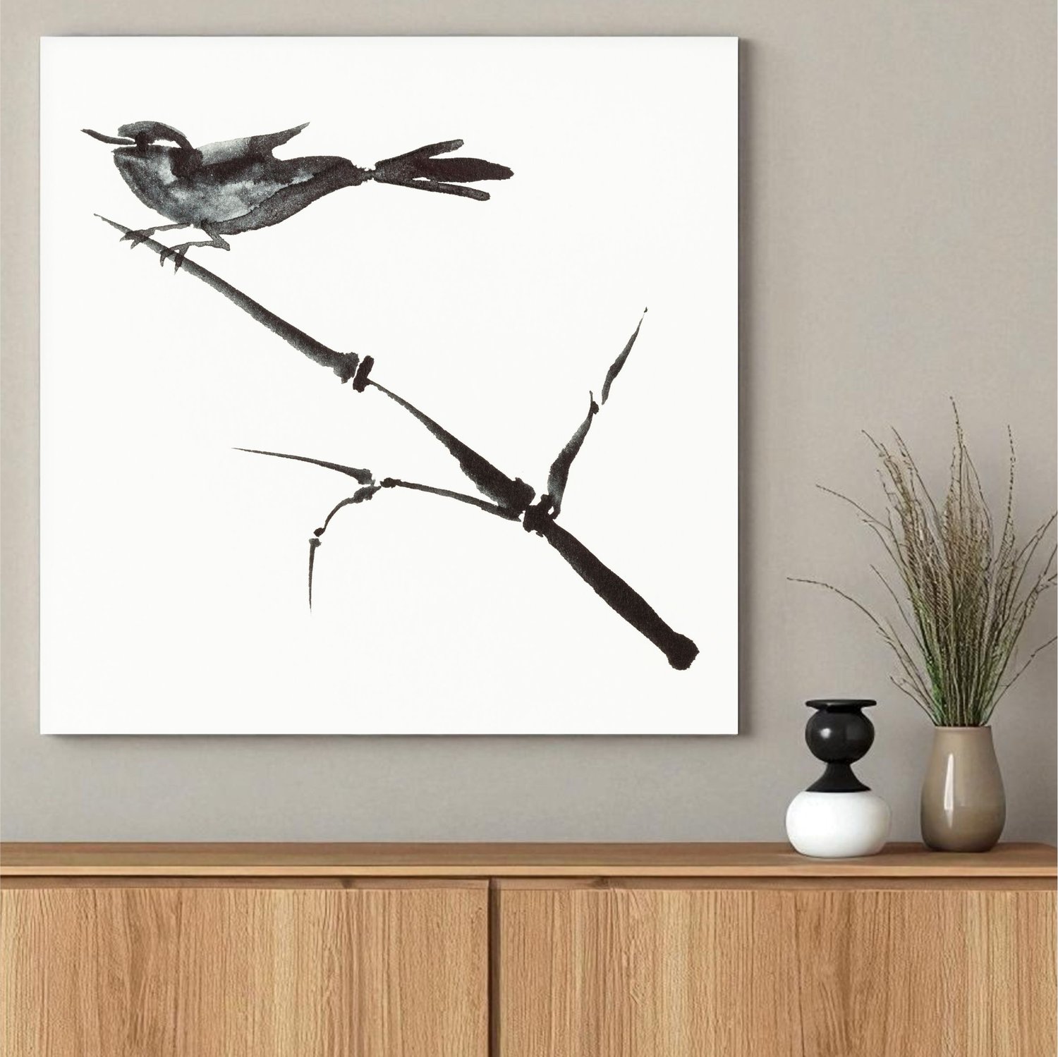 Placa Decorativa Suzume Pintura de Pardal Pousado em galho no Estilo Sumiê