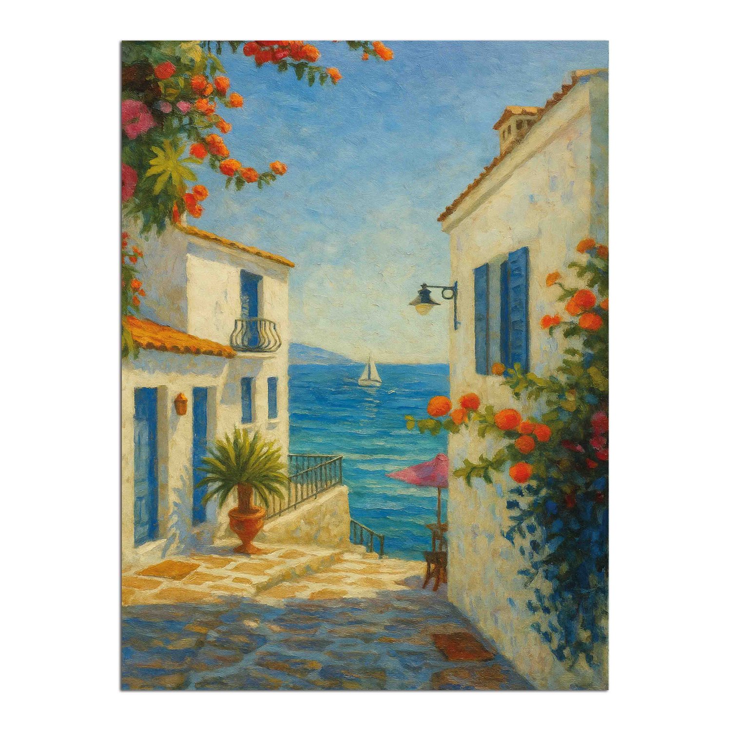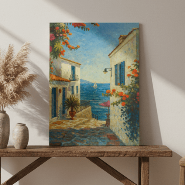 Placa Decorativa Viela Grega ao Mar Azul: Buganvílias e Sol Mediterrâneo