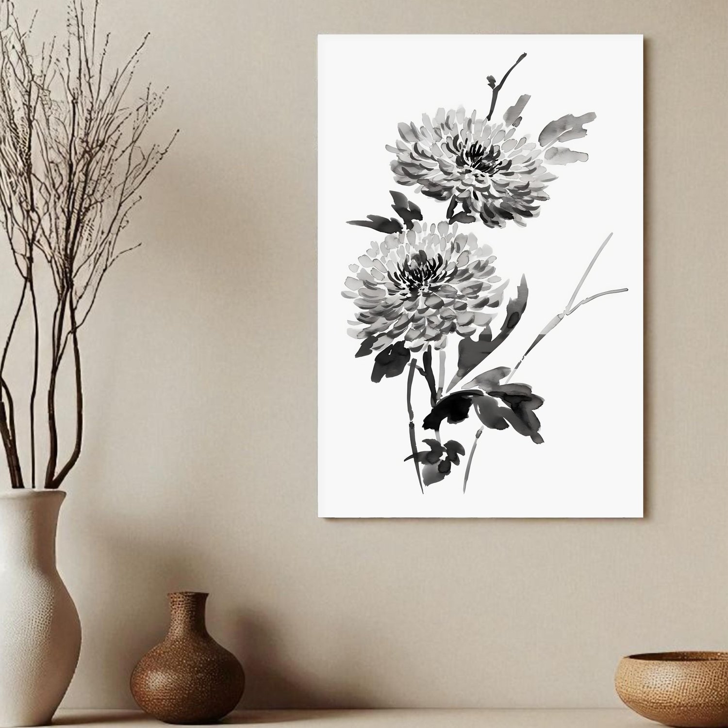 Placa Decorativa Kiku Pintura de Flor Ornamental Crisântemo no Estilo Sumiê
