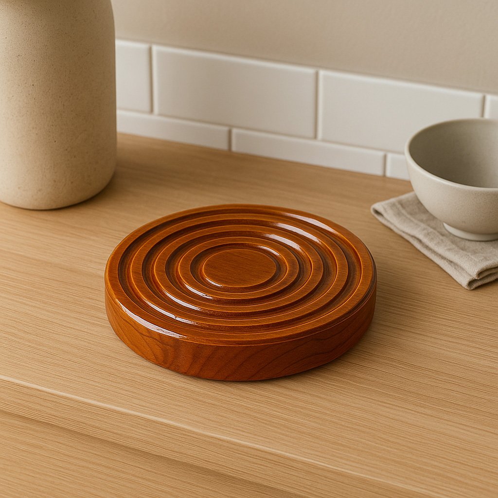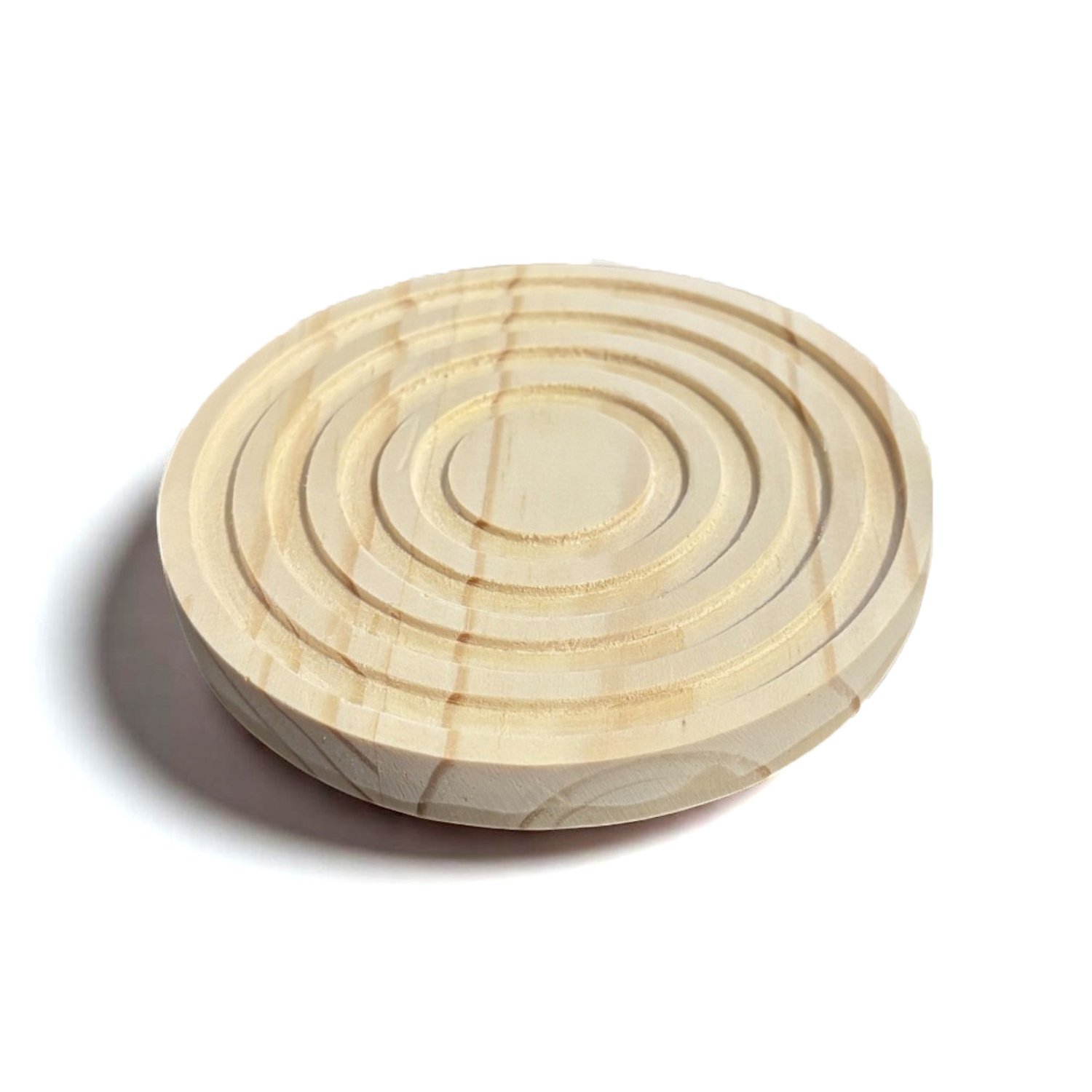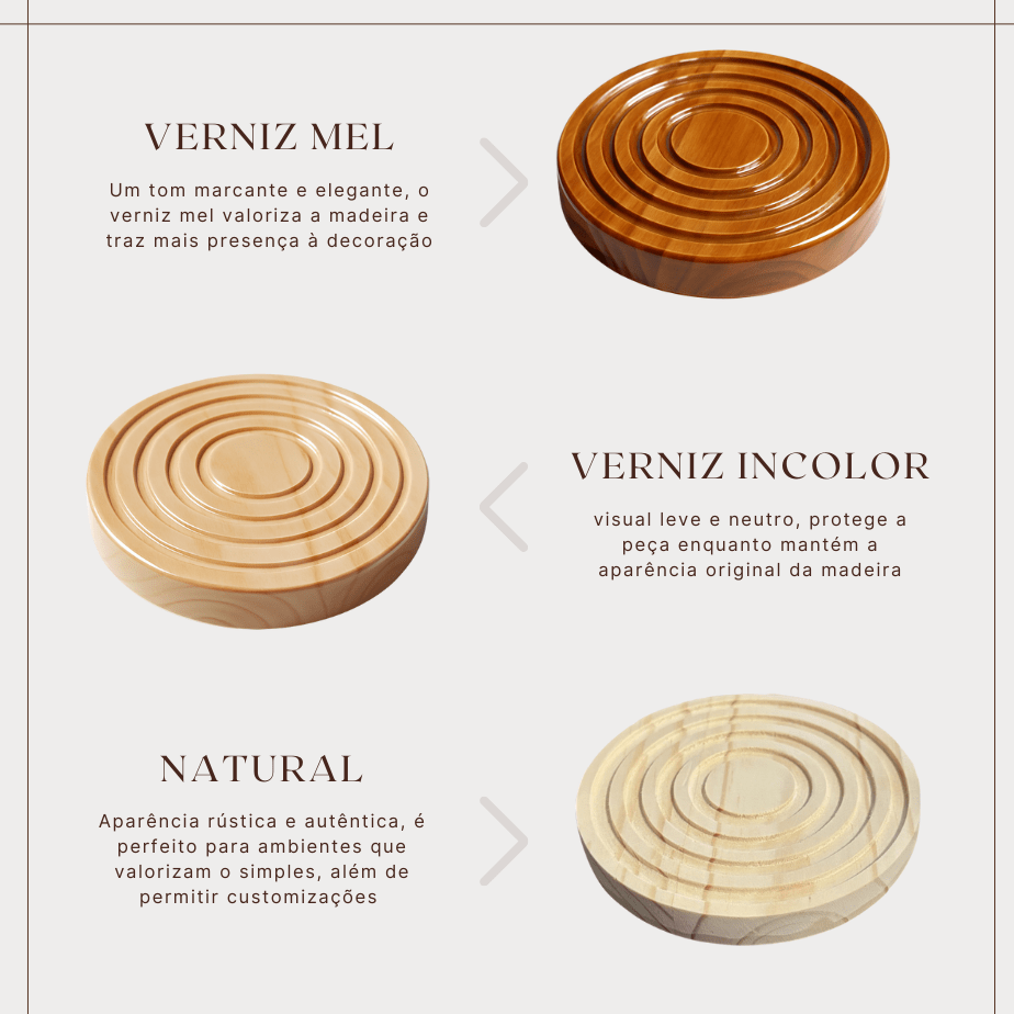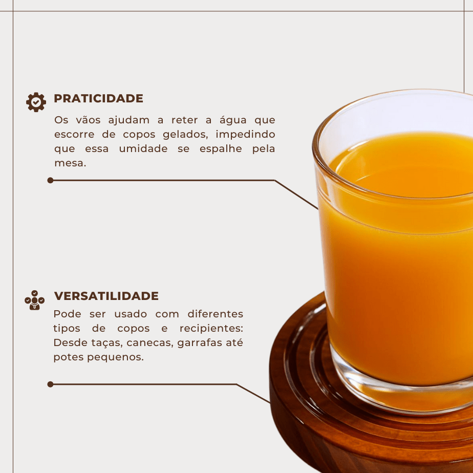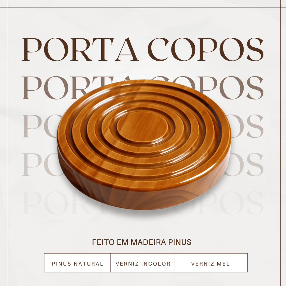Este porta-copos é feito em madeira de pinus, conhecida por sua leveza e textura suave. Seu design é minimalista e funcional, com rebaixos sutis na superfície para reter pequenas quantidades de água da condensação do copo, mantendo a mesa seca e protegida. A peça foi pensada para integrar ambientes que valorizam a harmonia visual, a naturalidade dos materiais e a simplicidade no uso.
