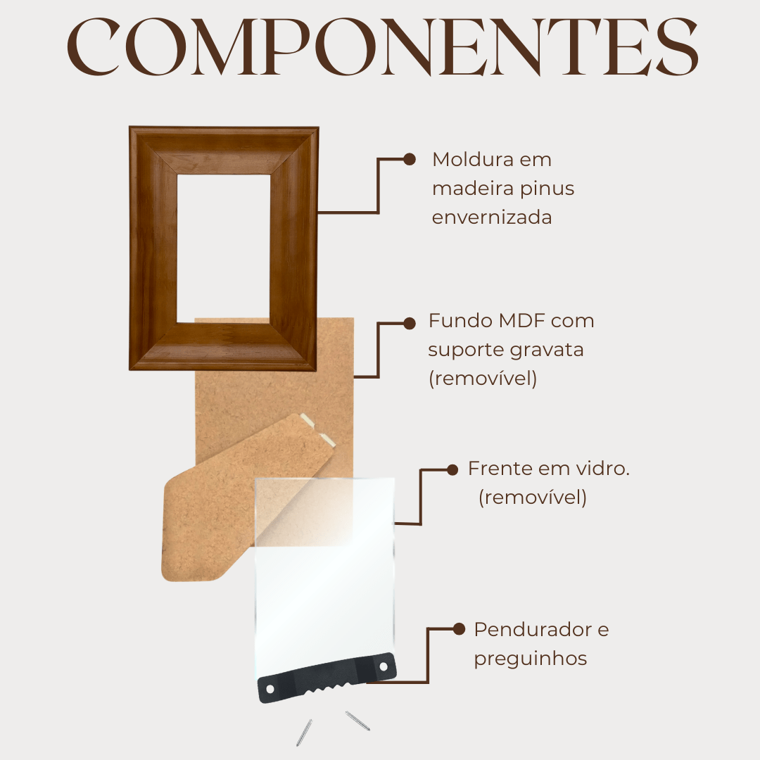 Material: Moldura em madeira pinus envernizada, fundo em MDF 3mm com suporte gravata e frente em vidro para proteção da imagem;