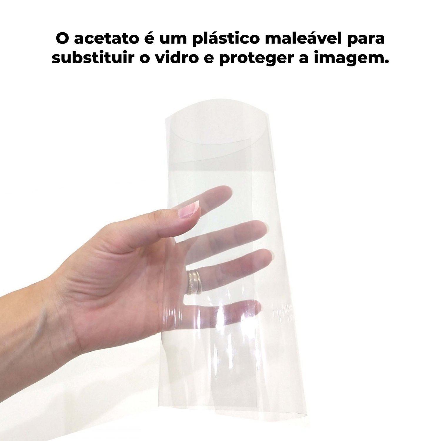 Material: Moldura, fundo com suporte e frente em acetato (plástico maleável);