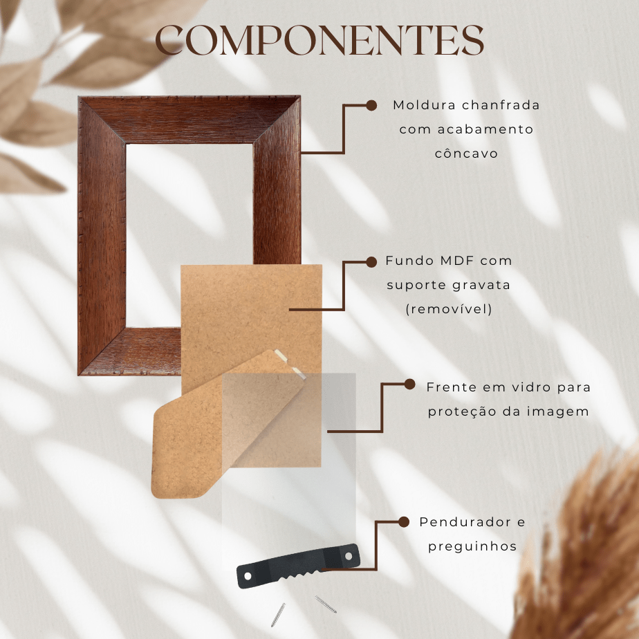 Material: Moldura em madeira eucalipto, fundo MDF com suporte gravata e frente em vidro;