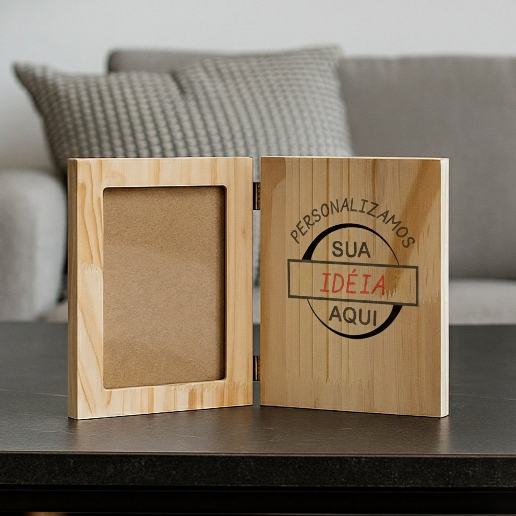 Porta-Retrato Sanfonado Personalizado Dobrável em Madeira Pinus com Vidro com Gravação a Laser ou Impressão UV