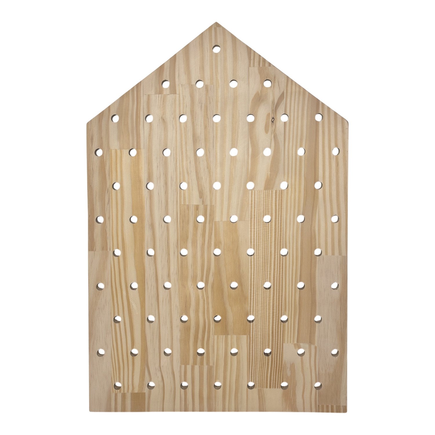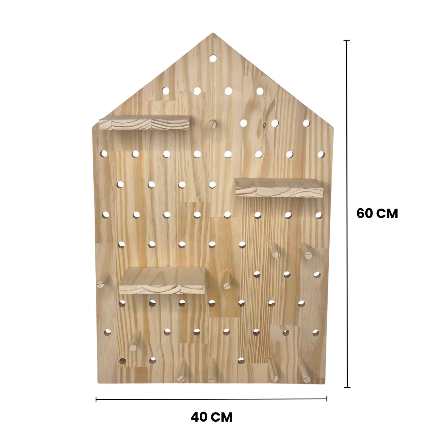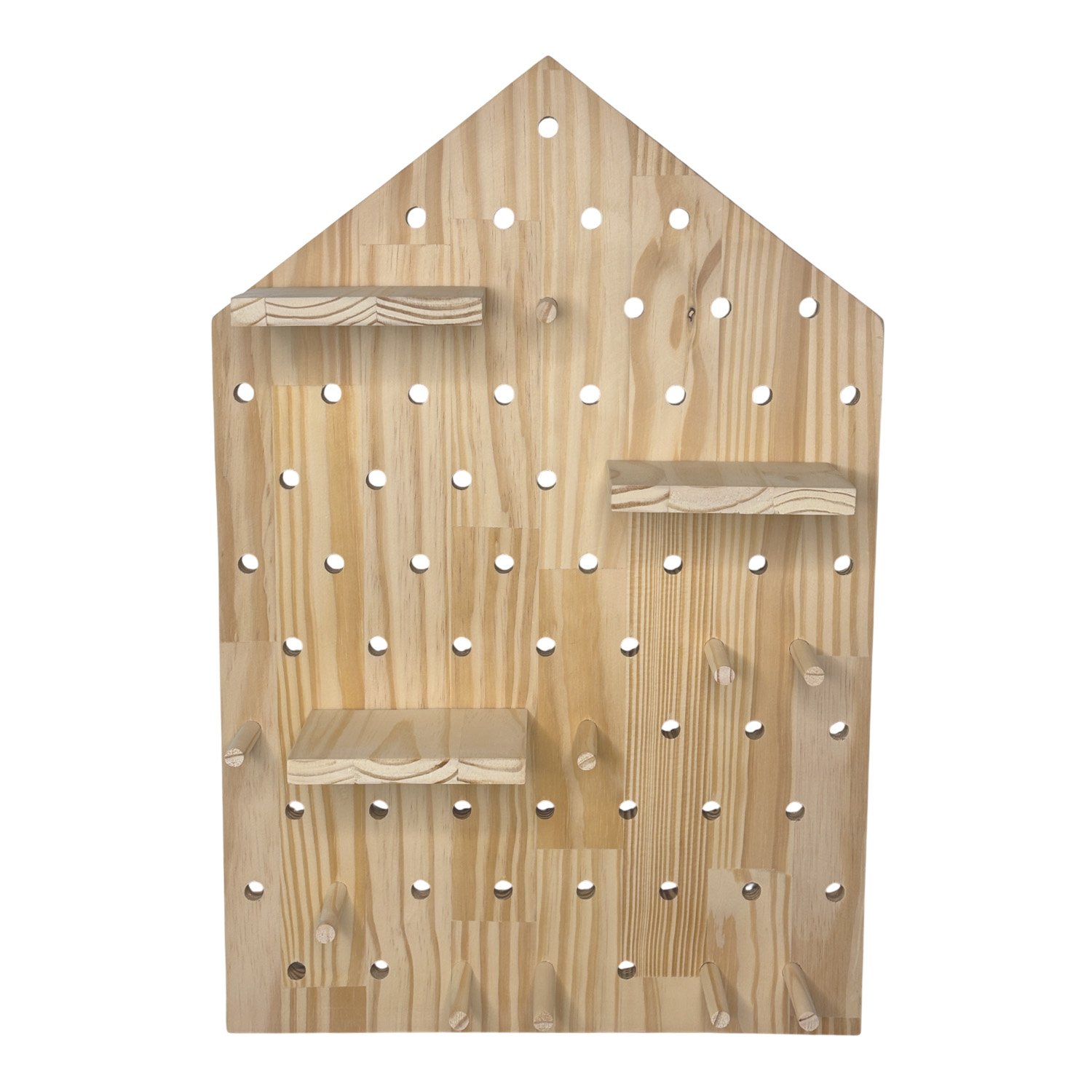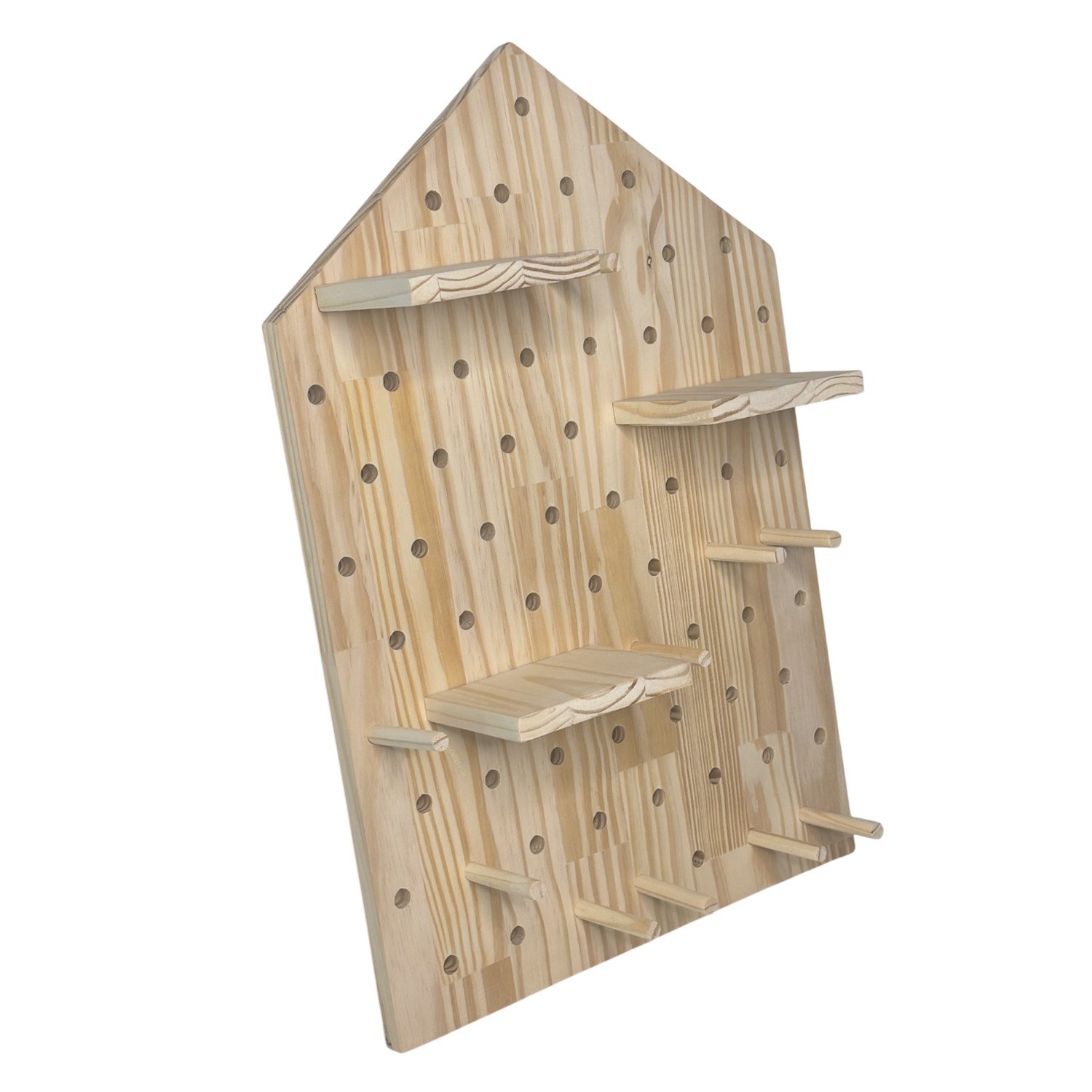 Prateleira Pegboard Casinha Em Madeira Pinus com 16 Pinos e 3 Prateleiras 13,5cm