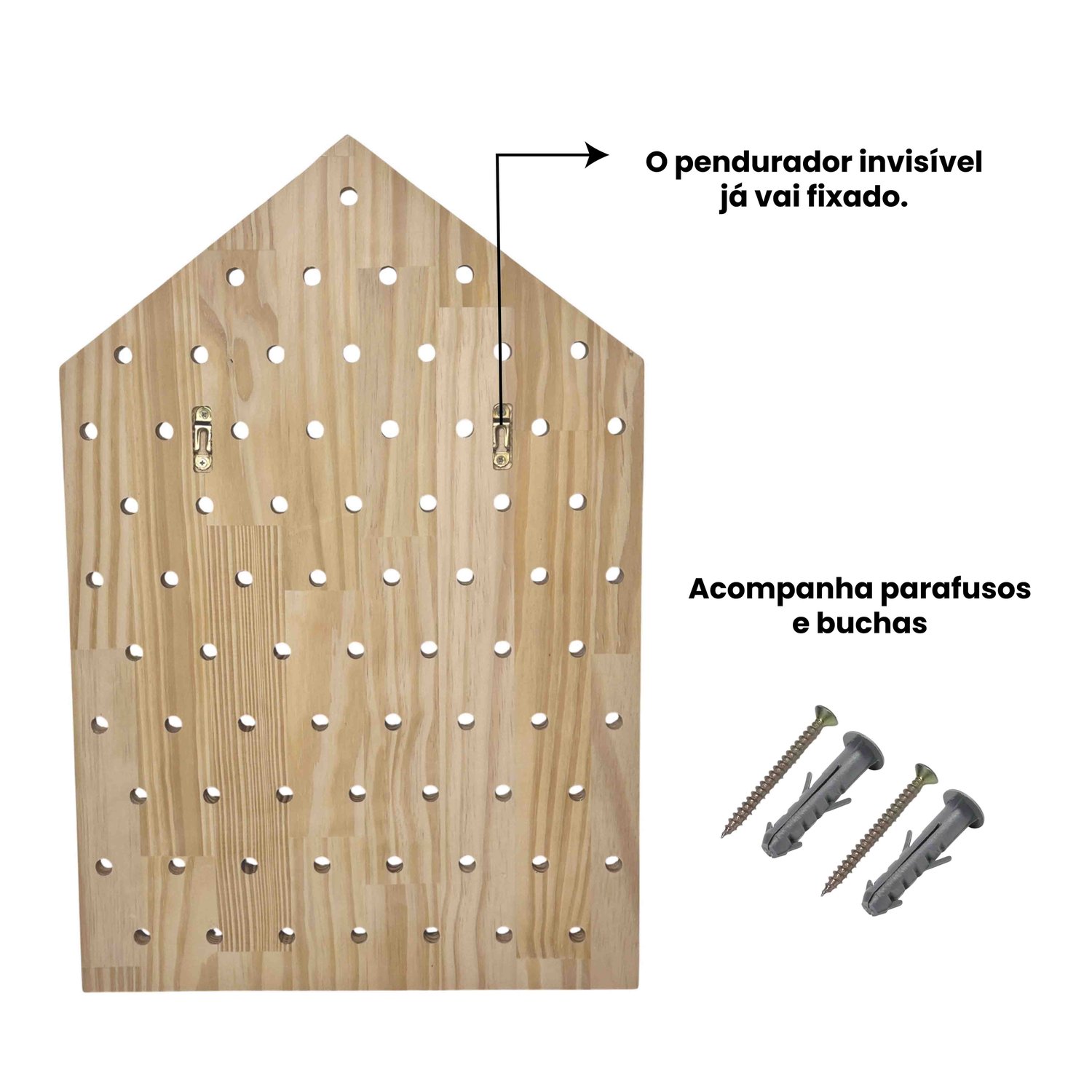 Aplicação: O Pegboard vai com pendurador invisível já fixado, para dar mais facilidade na hora de pendurar, o pegboard fica rente a parede. Por ser uma peça decorativa, não é indicado colocar peso;
