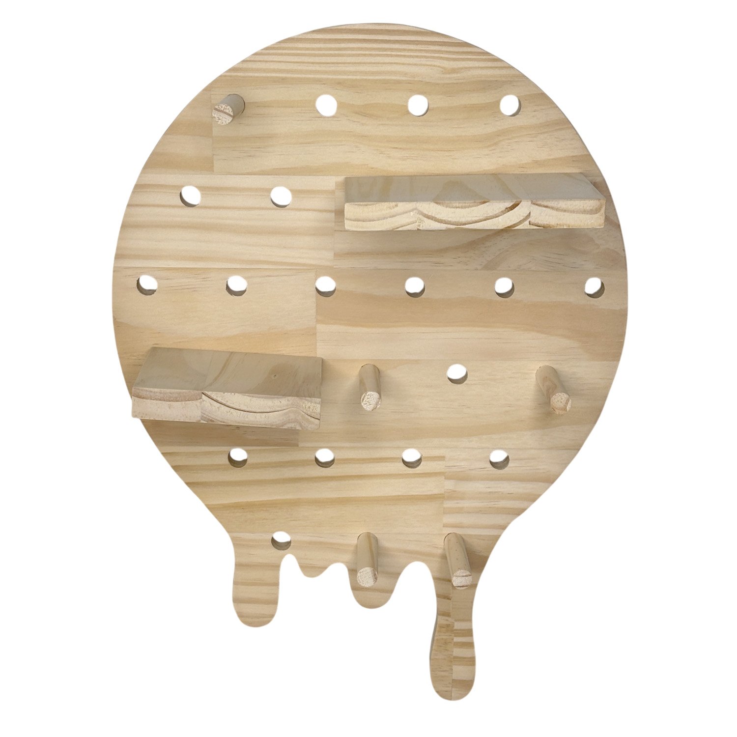 Prateleira Pegboard Circulo Derretendo Em Madeira Pinus com 9 Pinos, 1 Prateleia 13,5cm e 1 Prateleira 10cm