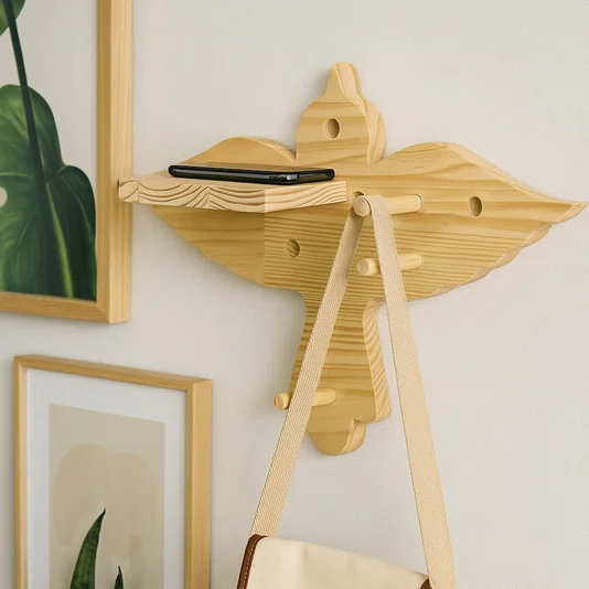 O Pegboard Pássaro foi criado para quem quer unir estética leve, toque natural e organização inteligente. Inspirado na silhueta de um pássaro, ele transforma a parede em um ponto de charme e funcionalidade. Feito em madeira de alta qualidade e com acabamento premium à escolha, ele oferece 5 pinos reposicionáveis e uma prateleira de 13,5 cm, perfeita para apoiar vasos, aromatizadores, porta-retratos, livros pequenos e objetos essenciais do dia a dia.