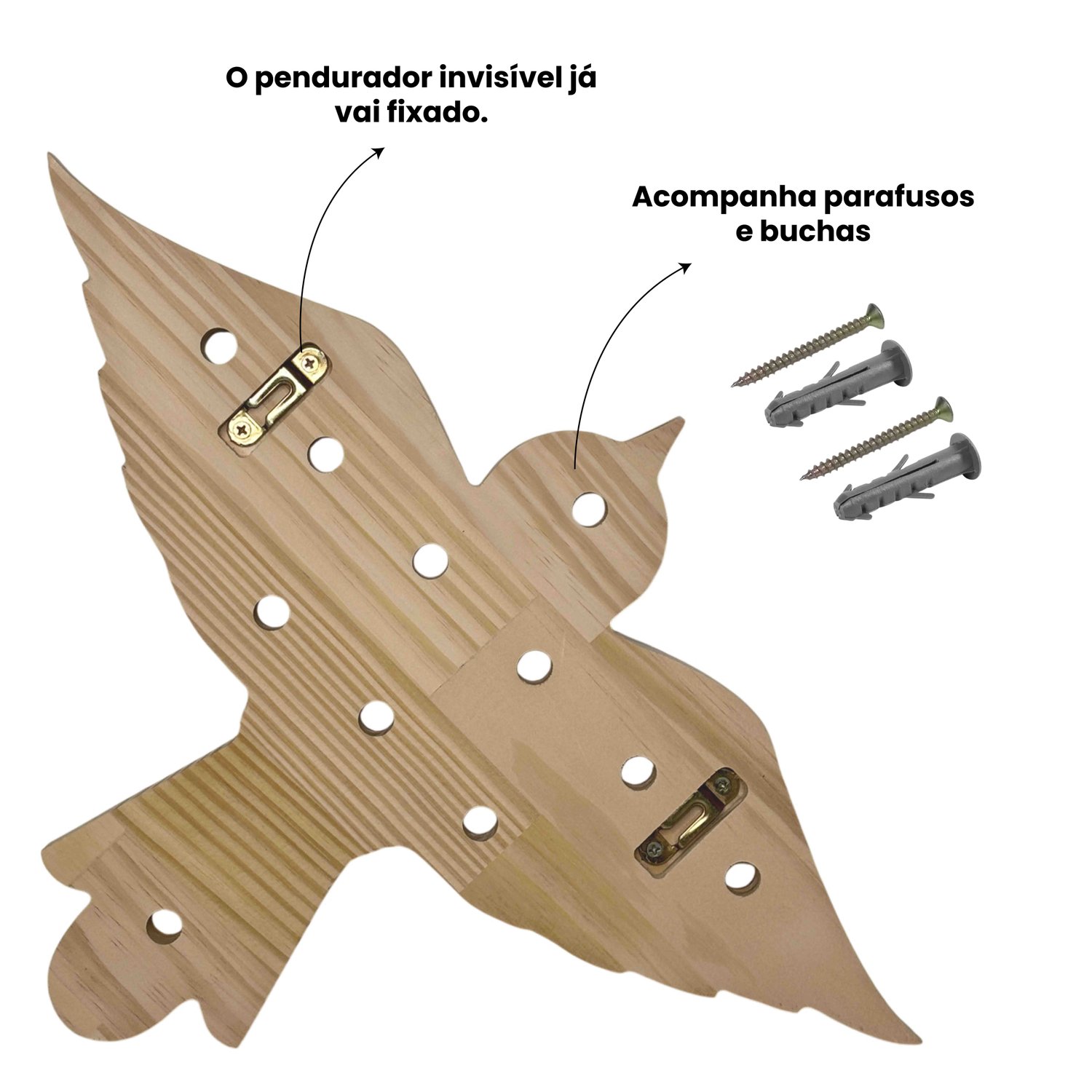 O design suave e orgânico traz uma sensação de acolhimento ao ambiente, enquanto a prateleira mais profunda permite criar composições maiores e mais impactantes. Ideal para quem deseja decorar com personalidade, mas não quer abrir mão da praticidade. Versátil e elegante, o Pegboard Pássaro combina com salas, halls de entrada, escritórios, cozinhas, quartos infantis e espaços criativos, trazendo ordem e beleza com a mesma intensidade. Com sua modularidade, você pode mudar os pinos sempre que quiser e adaptar o conjunto às necessidades do momento.