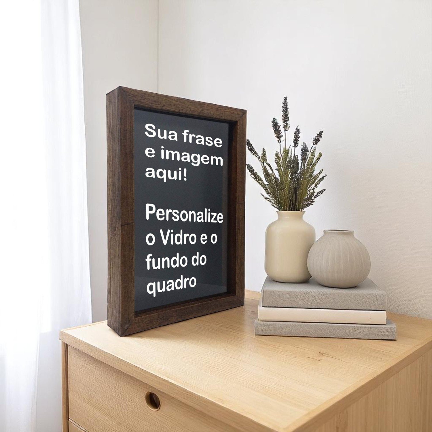 Após o pedido você receberá um email de confirmação de compra do email vendas@kiaga.com.br é só responder esse email com as imagens que deseja nos quadros/cofres, após o pagamento confirmado você receberá uma amostra para aprovação. Você pode enviar uma Frase para o Vidro que fica na parte frontal e uma imagem para o fundo, que fica na parte de trás. É importante você nos enviar um modelo de referência, para sabermos qual estilo de frase você gosta, como tipos de fontes, escritas, etc. Importante, a personalização será feita somente nas cores preto e branco.