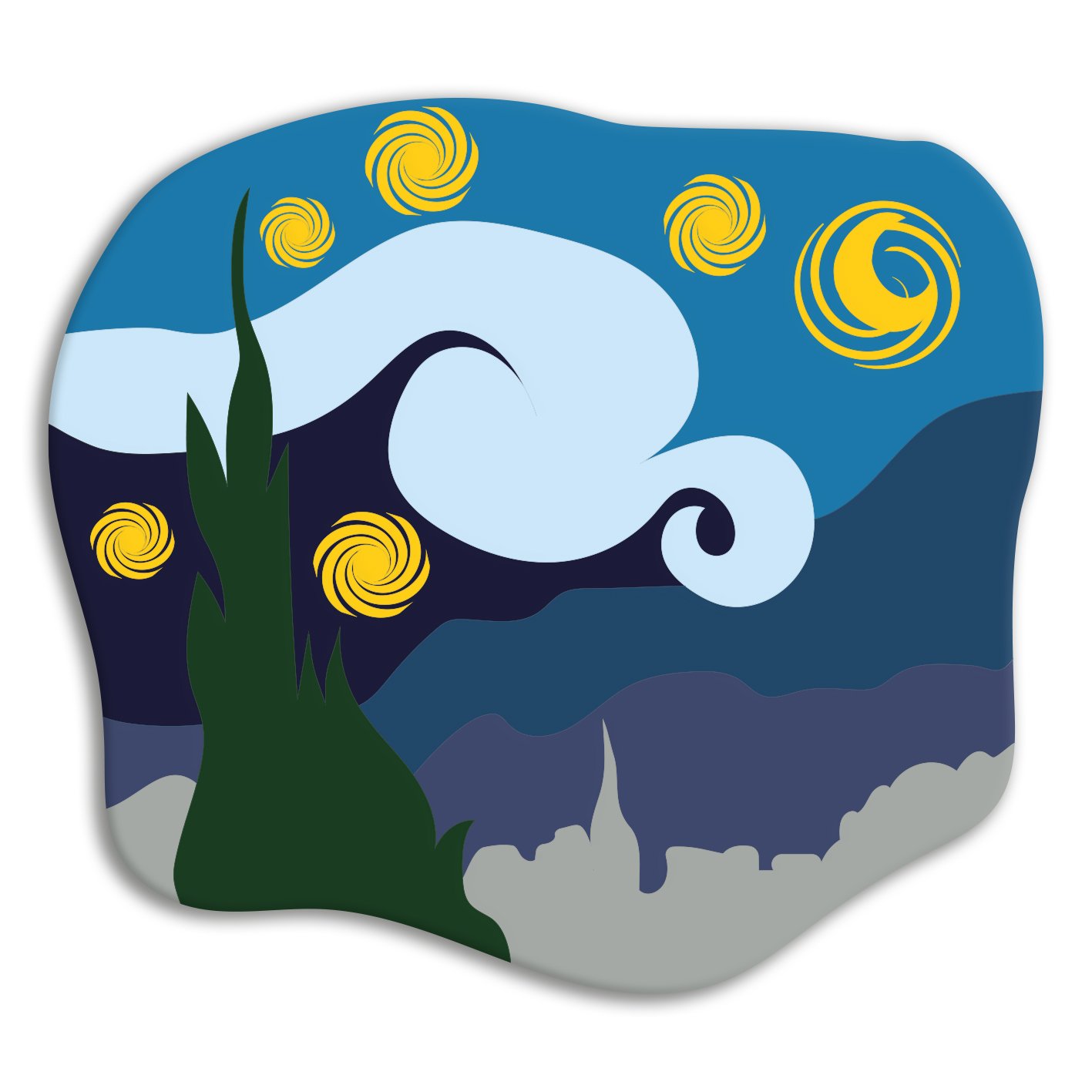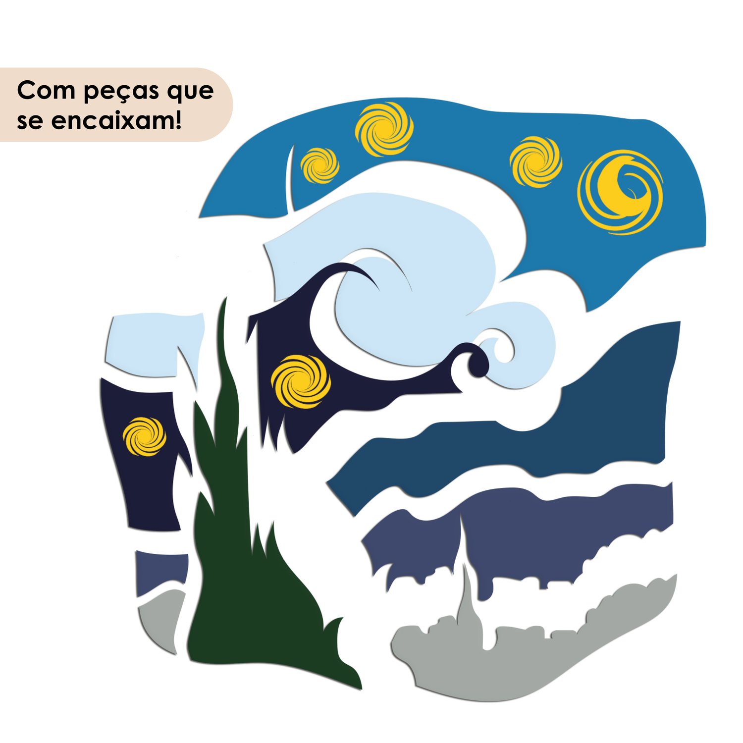 O quadro é inspirado na obra "Noite Estrelada", pintada por Vincent van Gogh em junho de 1889, é uma das obras mais icônicas da arte moderna. Criada enquanto Van Gogh estava internado em um asilo em Saint-Rémy-de-Provence, a pintura reflete seu estado emocional e sua busca por beleza. Caracterizada por cores vibrantes e pinceladas energéticas, a obra utiliza a técnica de impasto para criar textura e movimento no céu noturno. Após a morte de Van Gogh, "Noite Estrelada" ganhou reconhecimento e se tornou um ícone do expressionismo. Hoje, está exposta no Museu de Arte Moderna (MoMA) de Nova York, celebrada por sua beleza e profundidade emocional.