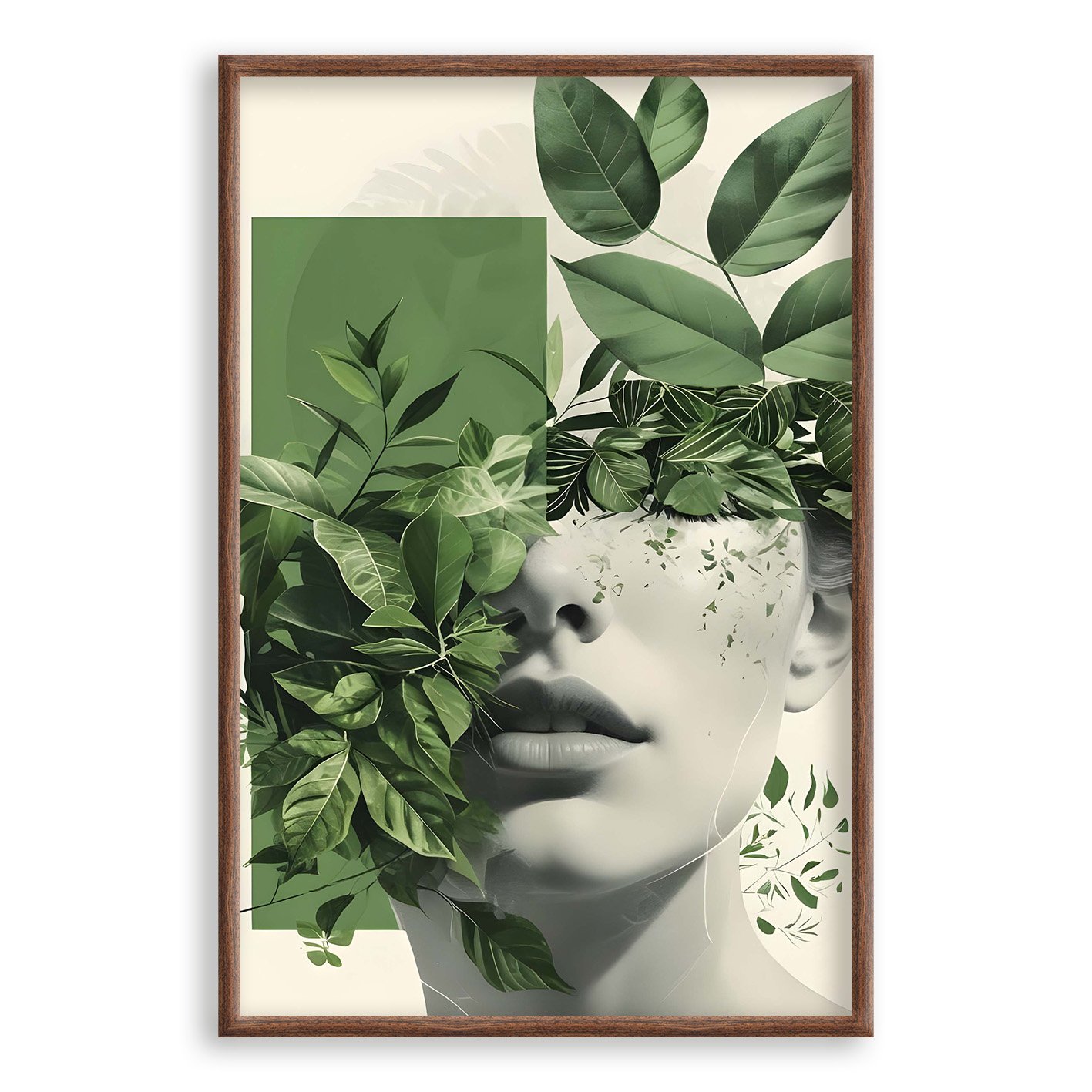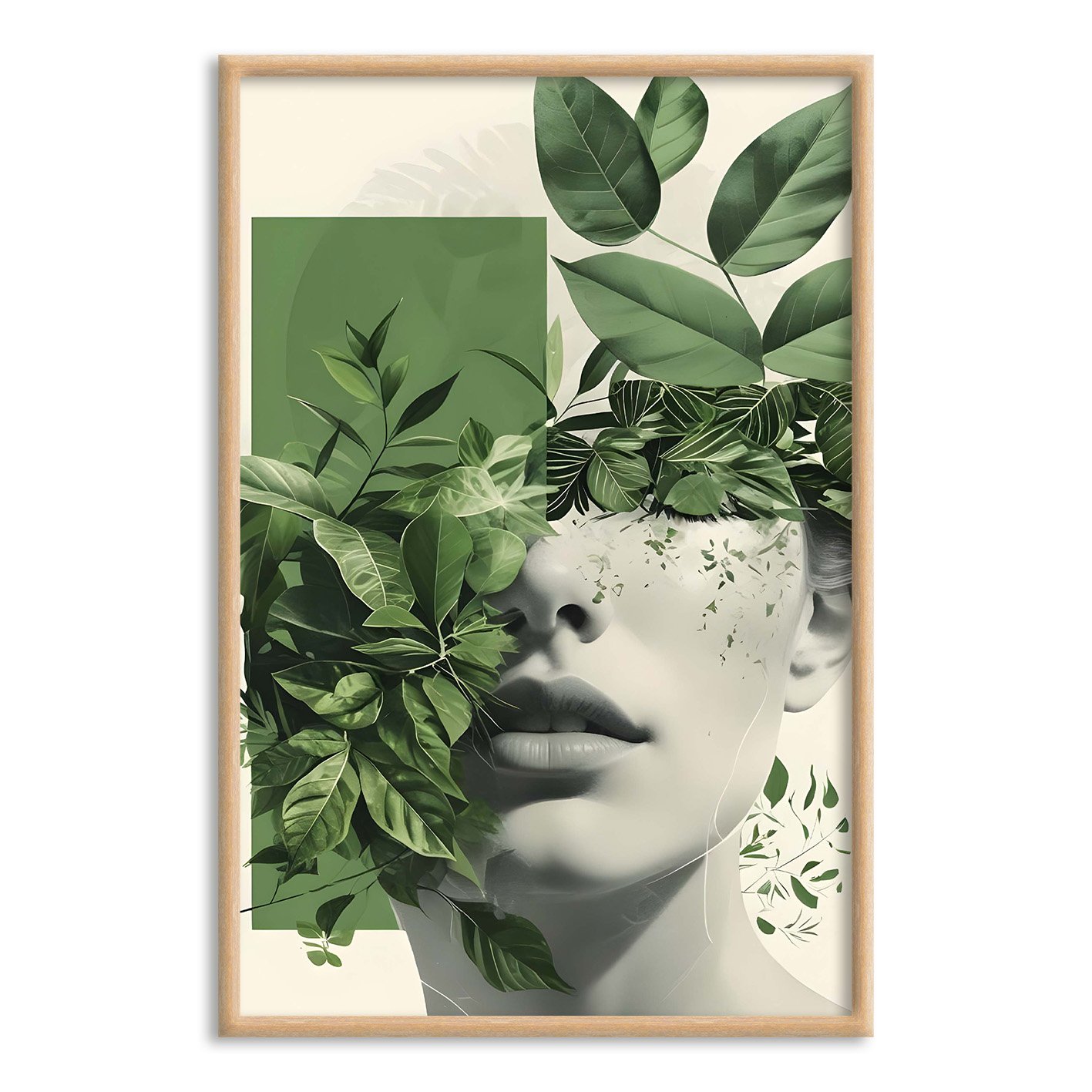 Quadro Decorativo Abstrato Com Rosto e Folhas Verdes