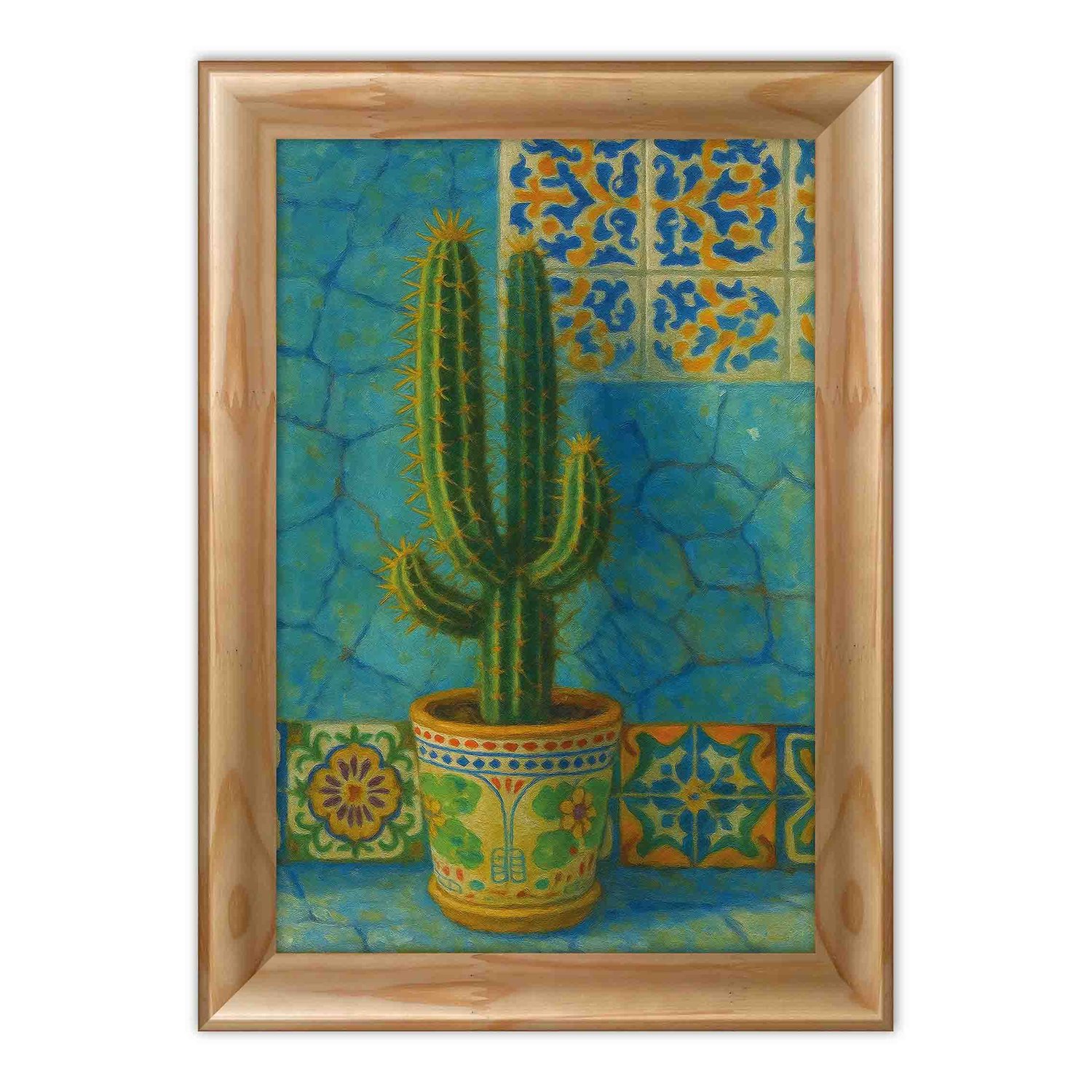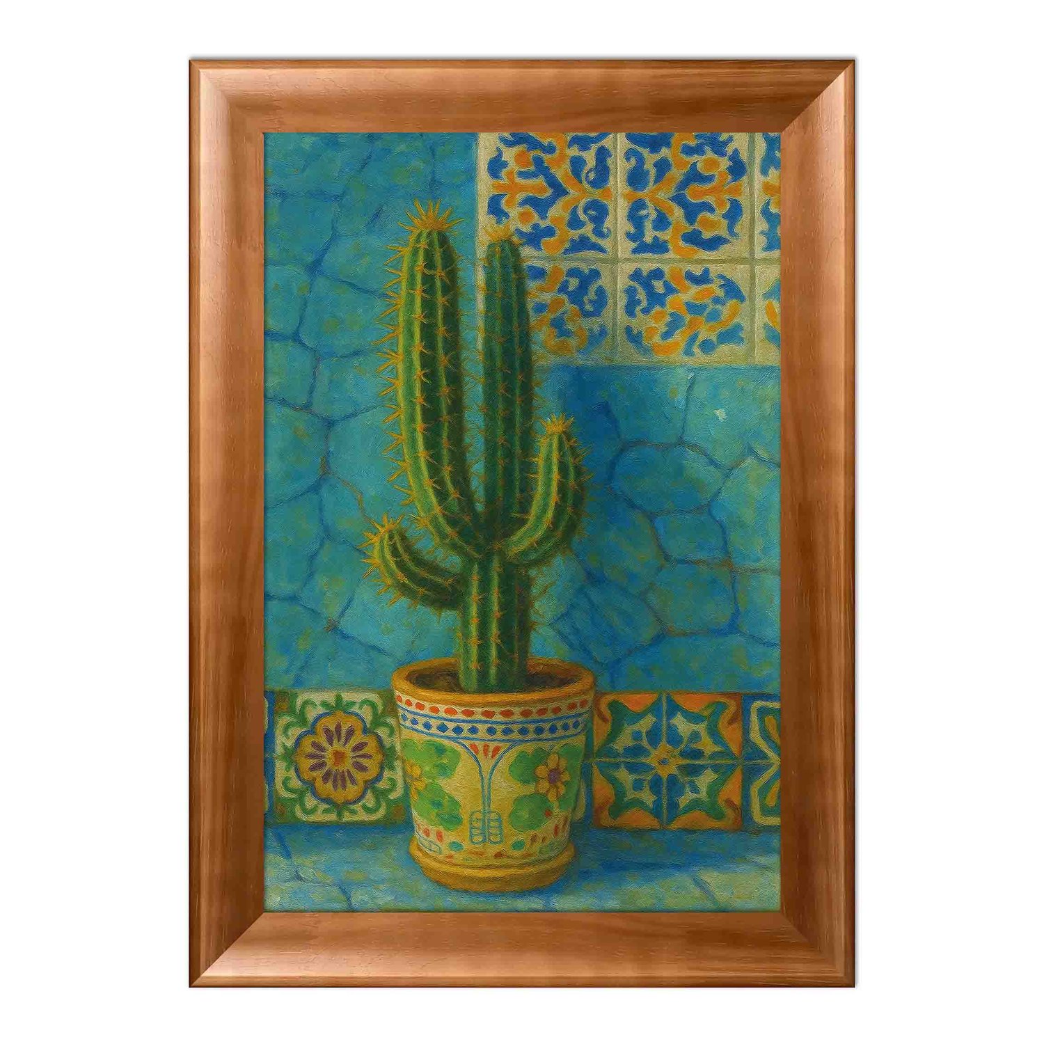 Quadro Decorativo Cacto Ornamental em Vaso Maiólica Contra Parede de Azulejos Azul-Turquesa