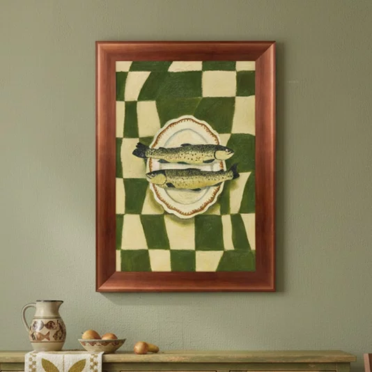 Leve arte, textura e originalidade para o seu ambiente com o Quadro Decorativo Estilo Pintura Folk Moderna, Composição de Peixes no Prato Oval em Fundo com Padrão Xadrez Verde Texturizado. Uma peça que une o encanto da estética folk ao toque contemporâneo do design retrô, criando uma obra visualmente marcante e cheia de personalidade. As pinceladas aparentes e o efeito artesanal trazem vida e autenticidade à obra, transmitindo a sensação de uma pintura feita à mão, ideal para quem valoriza arte com alma e presença visual. Com impressão de alta qualidade, o quadro oferece cores vibrantes, nitidez e longa durabilidade, garantindo impacto estético por muitos anos. O verde texturizado cria profundidade e aconchego, tornando a peça perfeita para cozinhas gourmet, restaurantes, bistrôs, peixarias elegantes, cafés temáticos e espaços de gastronomia, além de residências que desejam trazer um toque artístico e acolhedor à decoração. Essa composição se harmoniza com móveis em madeira natural, tons neutros e elementos rústicos ou contemporâneos, resultando em uma atmosfera equilibrada entre o clássico e o moderno.