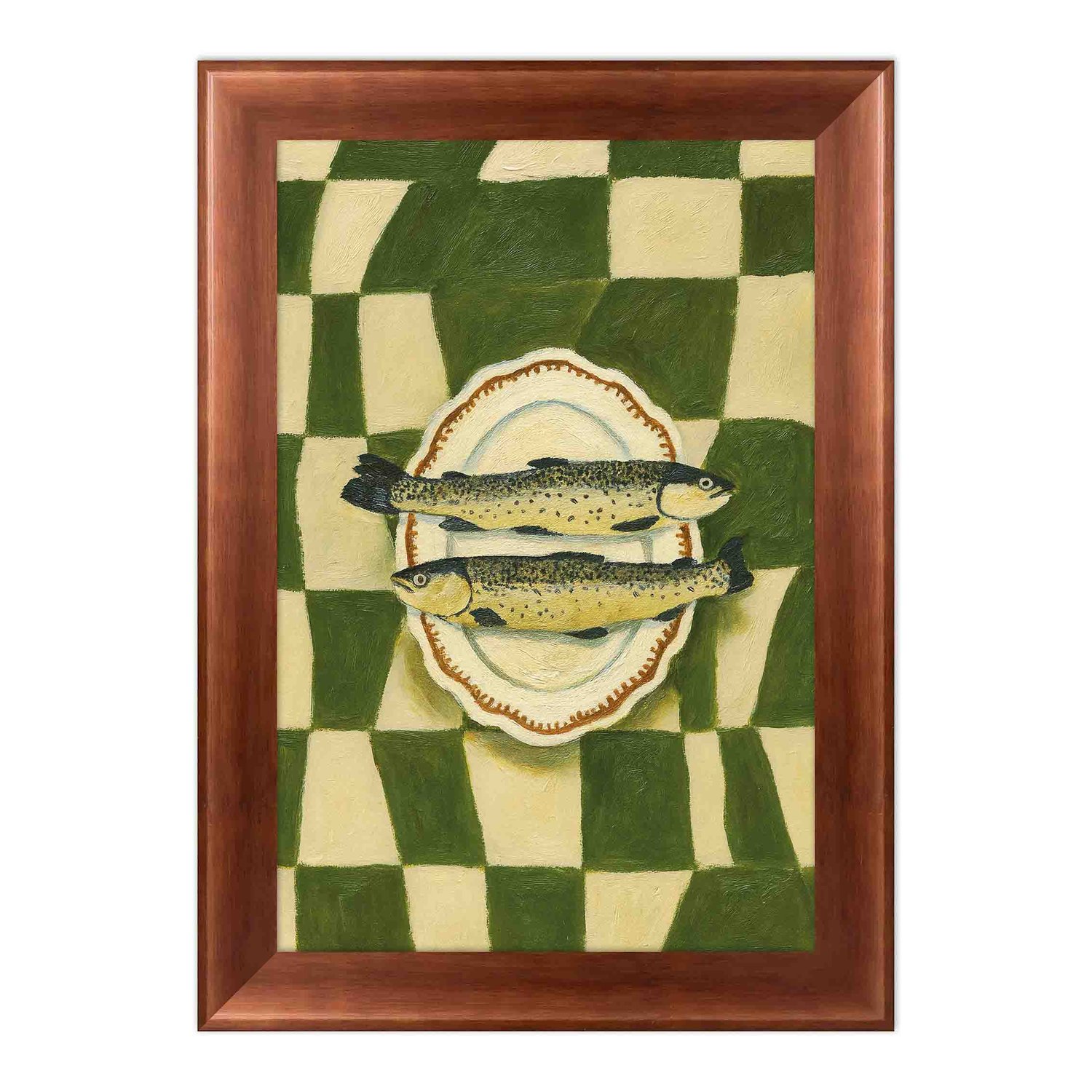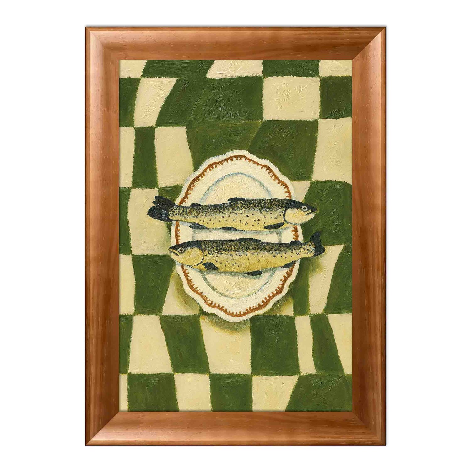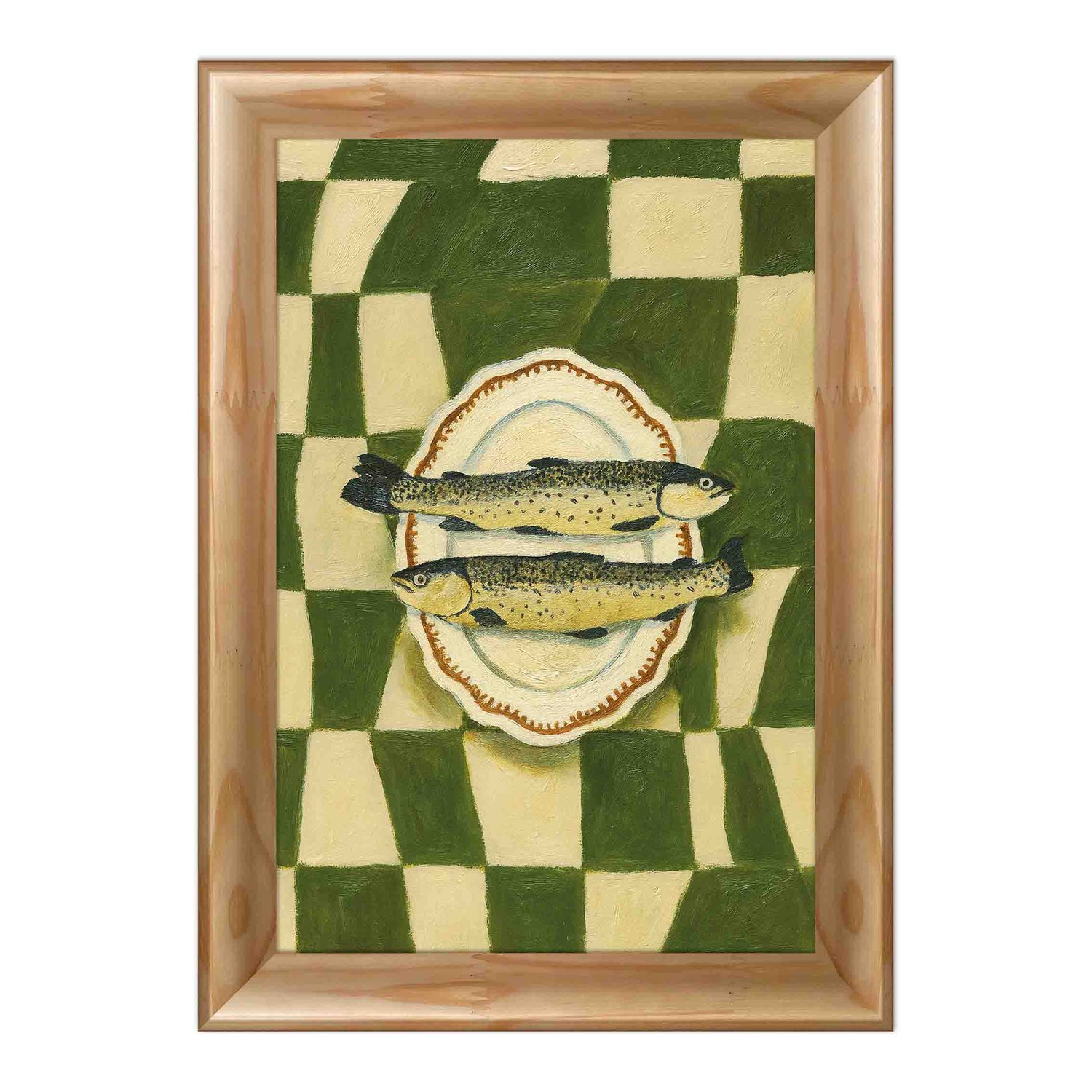 Quadro Decorativo Estilo Pintura Folk Moderna Composição de de Peixes no Prato Oval em Fundo com Padrão Xadrez Verde Texturizado