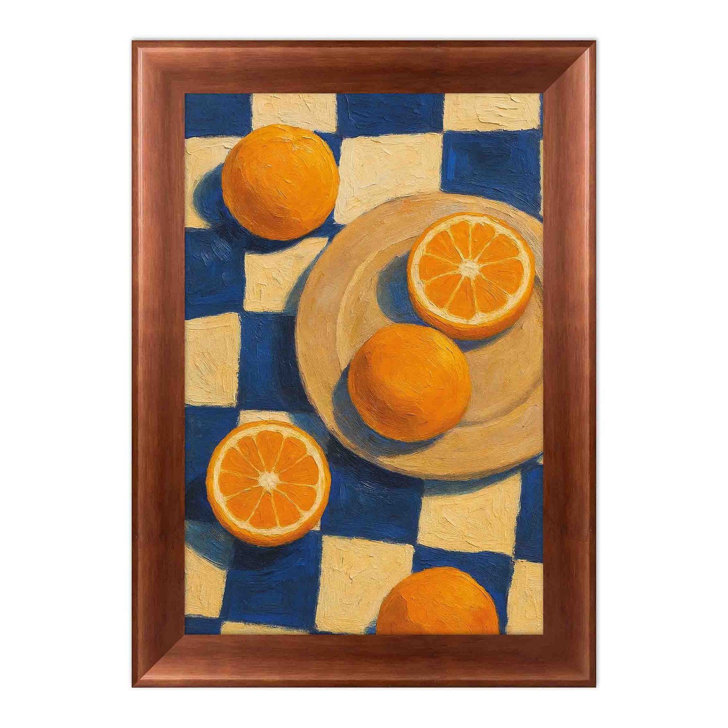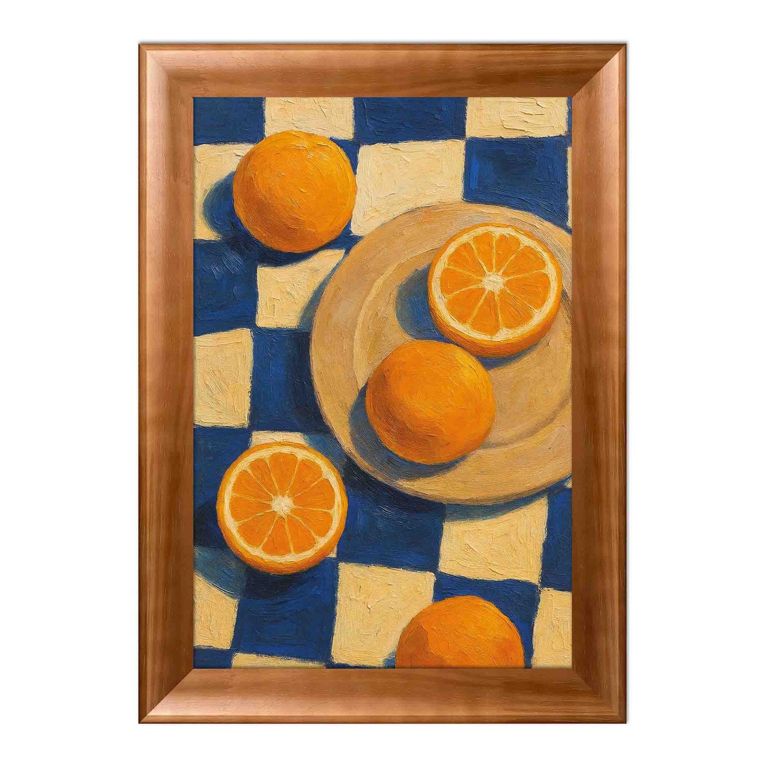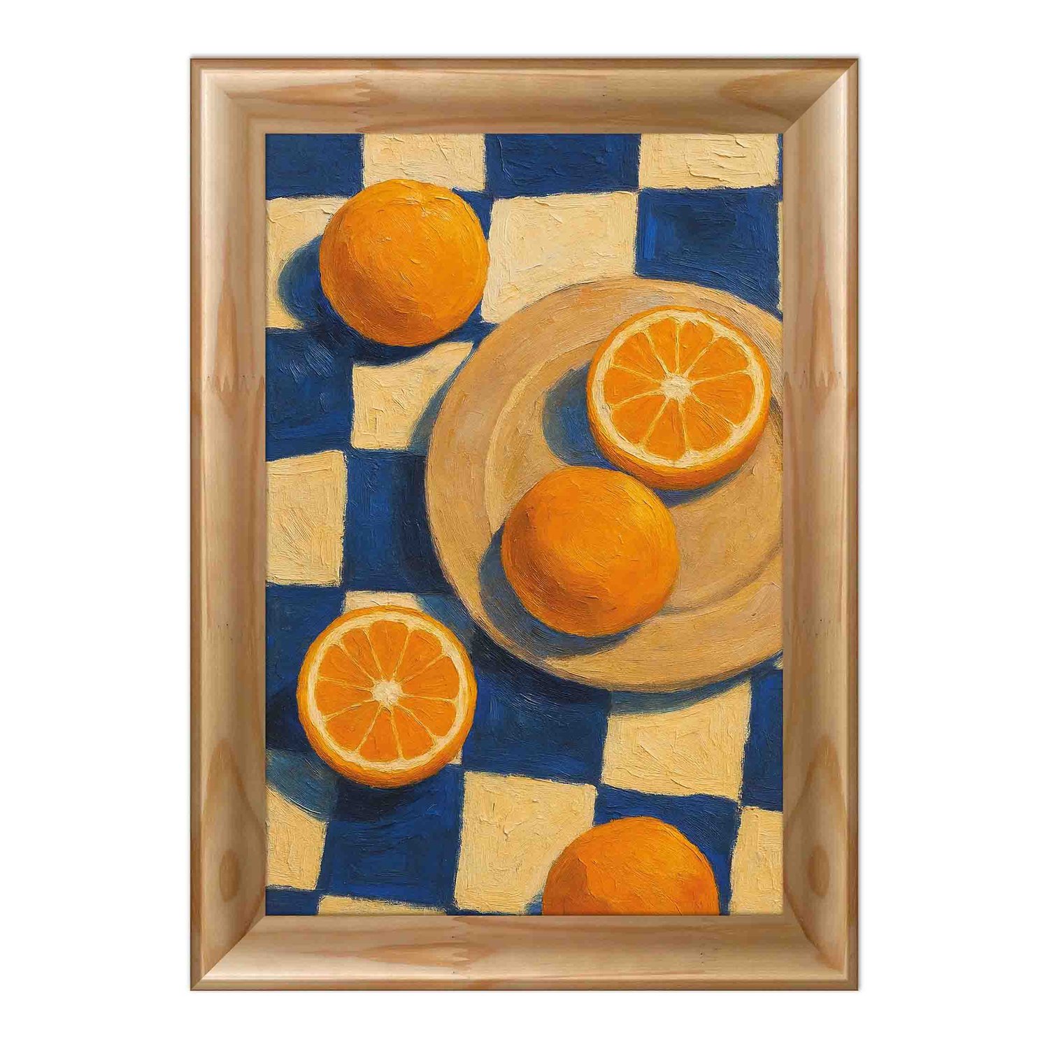 Ilumine seu ambiente com o frescor e o charme artesanal do Quadro Decorativo Estilo Pintura Folk Moderna Composição de Laranjas no Prato e sobre o Fundo Xadrez Azul Texturizado. Uma obra que celebra a simplicidade elegante do cotidiano através da cor, da textura e da harmonia visual perfeita para quem busca uma decoração vibrante, artística e com identidade própria.