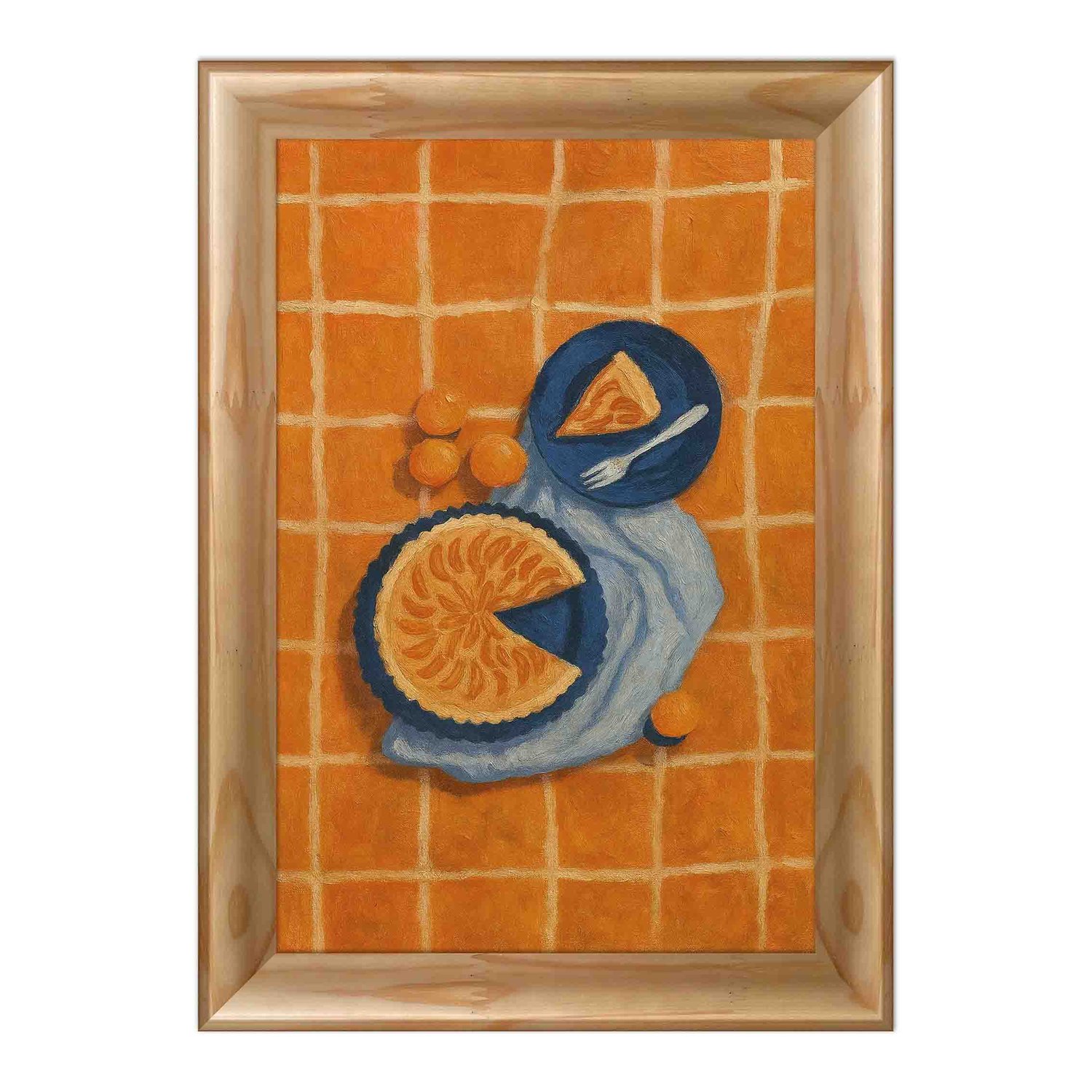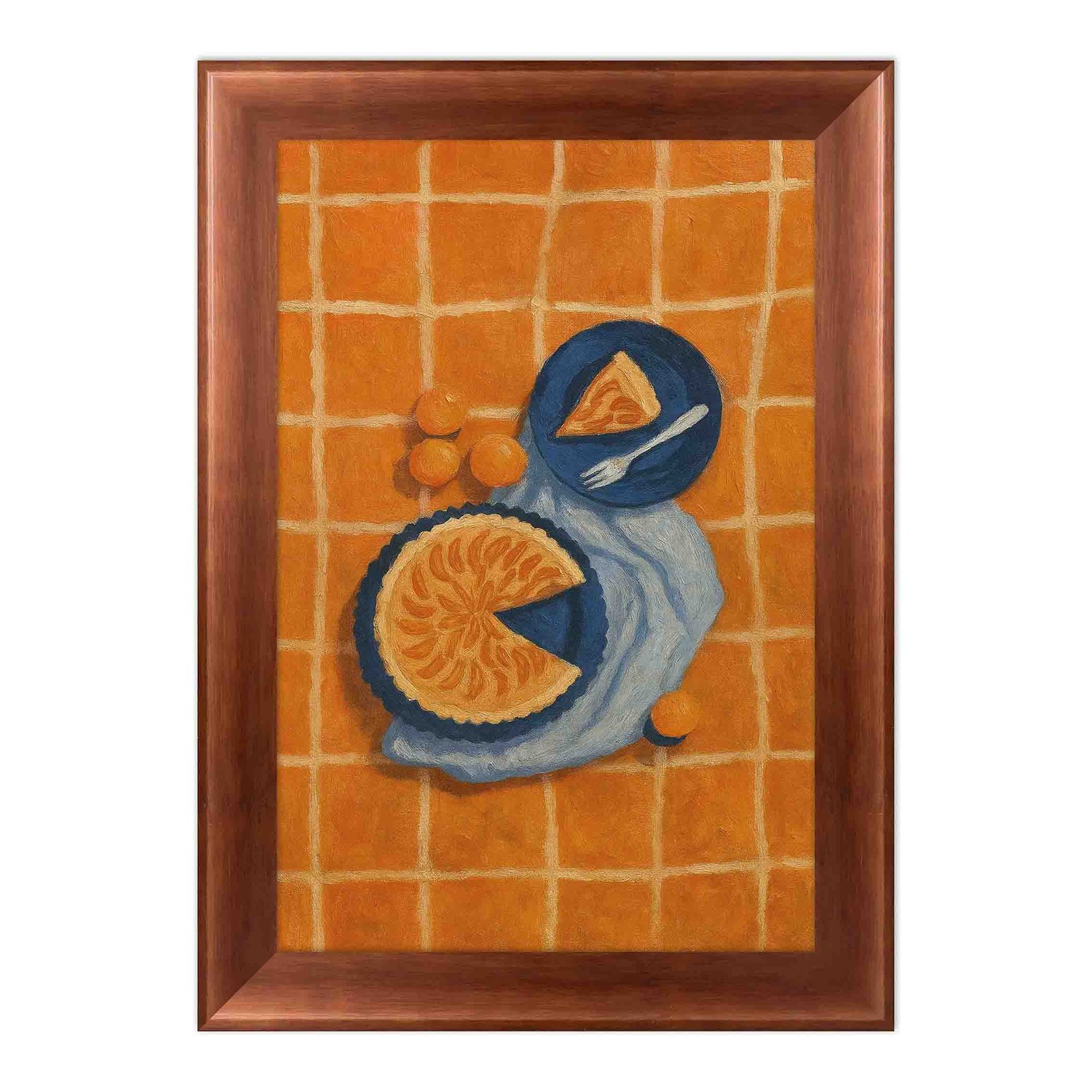 A composição retrata uma torta artesanal e frutas frescas dispostas em pratos azuis, contrastando com o fundo xadrez laranja vibrante. O jogo entre cores quentes e frias cria um equilíbrio visual envolvente, que desperta sensações de conforto, alegria e prazer estético. As pinceladas texturizadas conferem à obra um aspecto artesanal e tátil, simulando o efeito de uma pintura feita à mão perfeita para quem busca arte com alma e presença visual marcante.