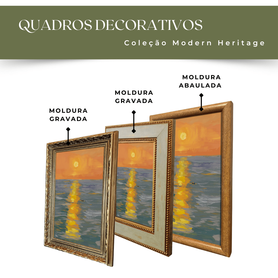 A coleção Modern Heritagefoi criada para quem entende que decoração é identidade. Inspirados na união entre o design clássico e a estética contemporânea, nossos quadros decorativos transformam ambientes comuns em espaços sofisticados, elegantes e atemporais. Cada peça foi pensada como um ponto focal, capaz de elevar salas, quartos, escritórios e ambientes corporativos com presença visual e refinamento.