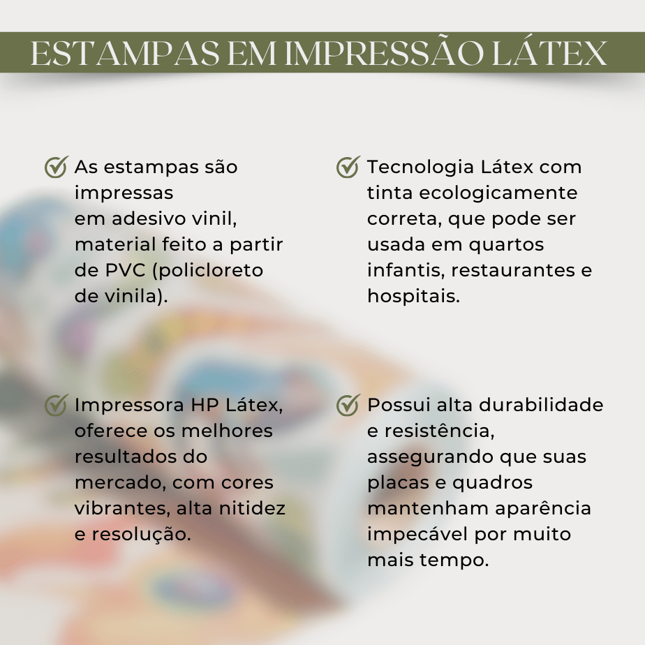 Material: Estampas em adesivo vinil, fundo em mdf 3mm, molduras lisas com laminação e moldura gravada com relevo em gesso.