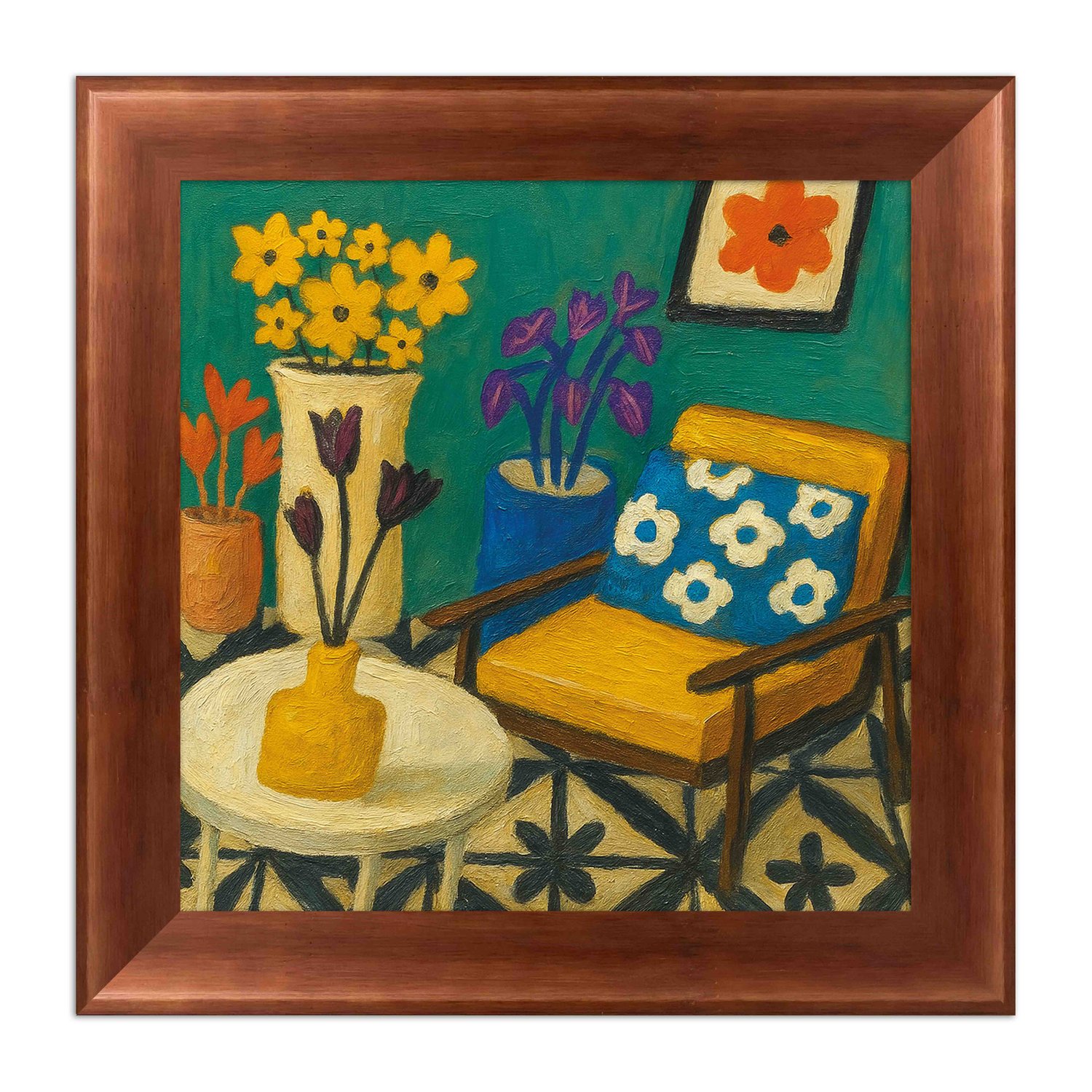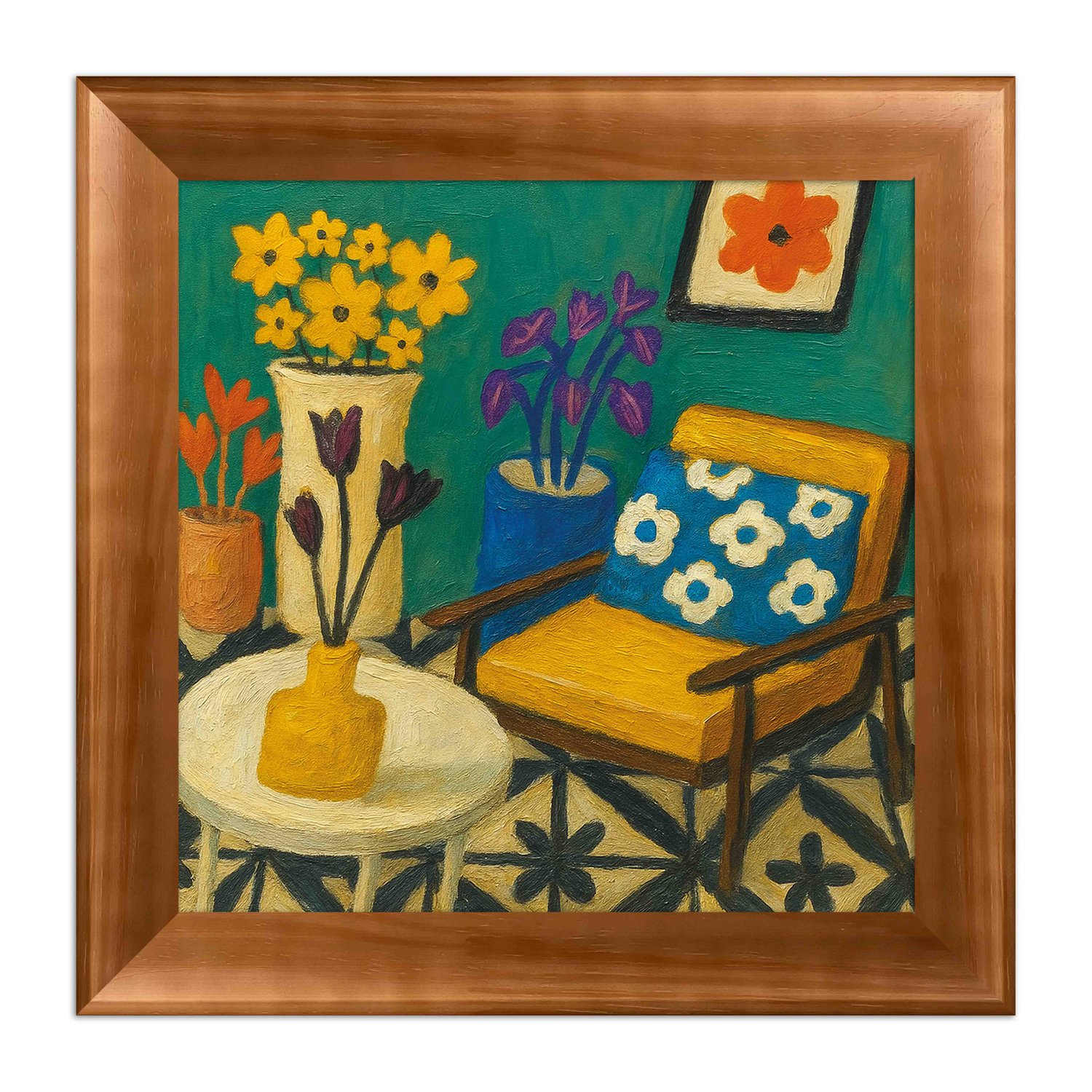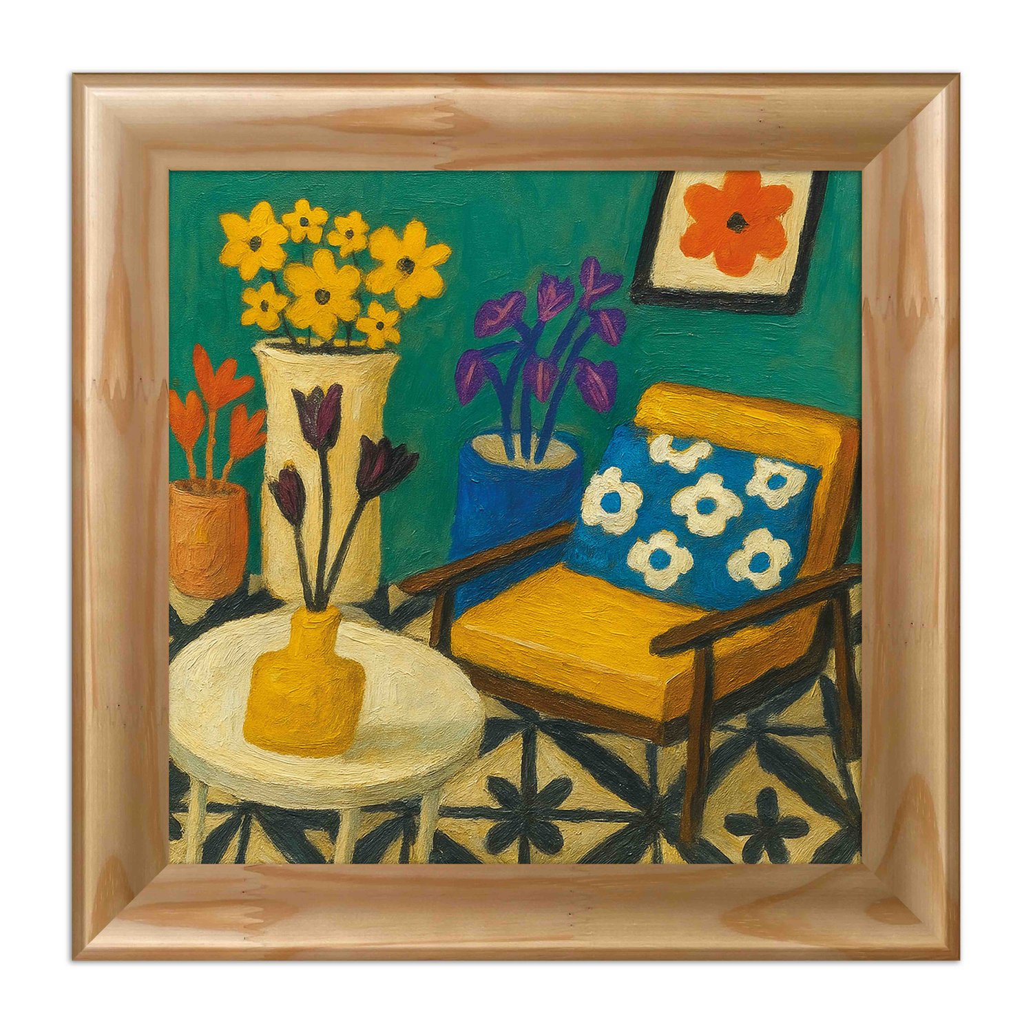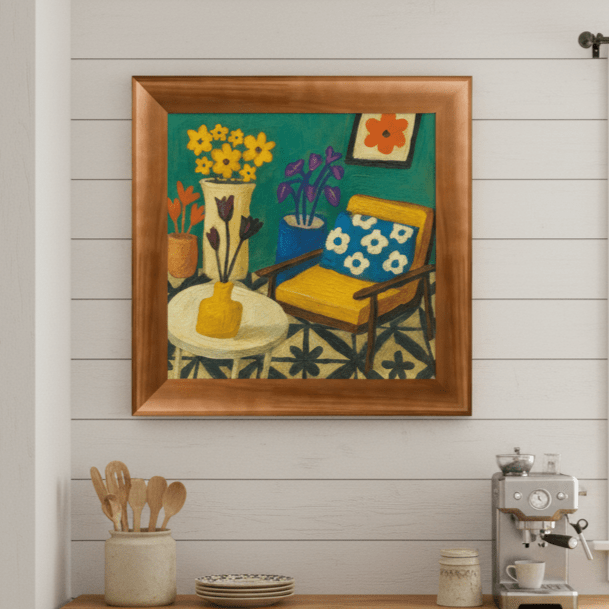 Quadro Decorativo Interior com Cadeira Amarela e Padrões Geométricos: Natureza Morta em Tons de Turquesa e Mostarda