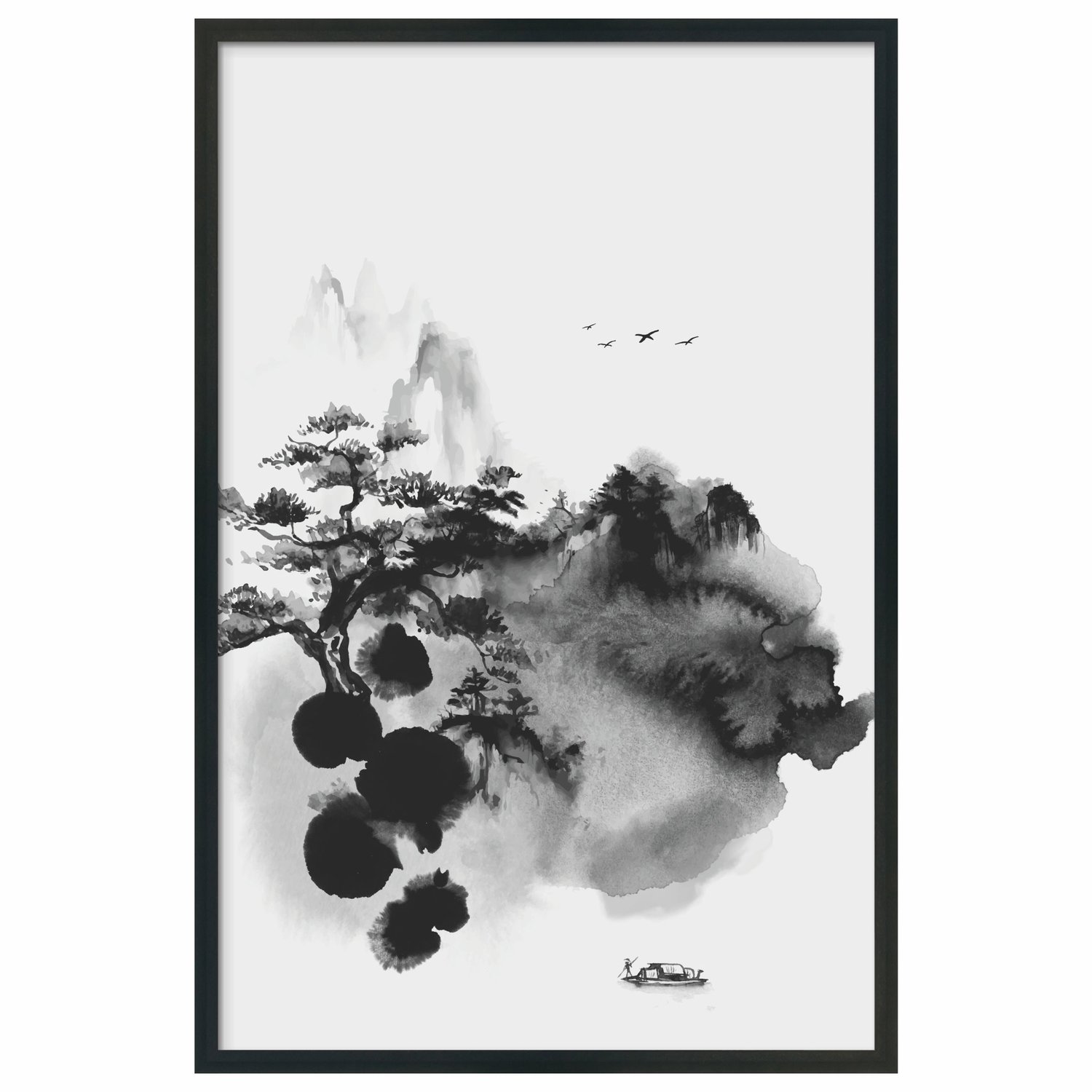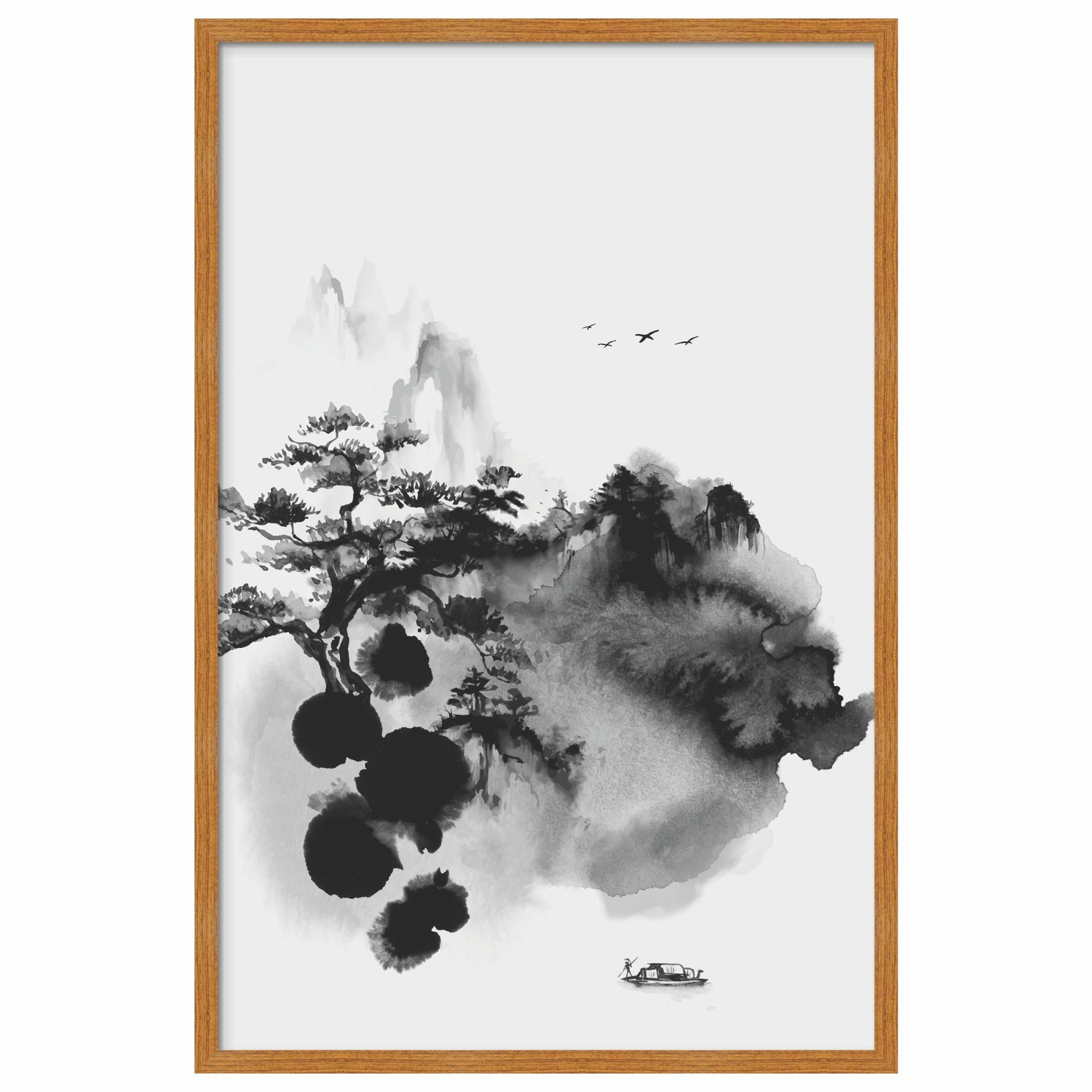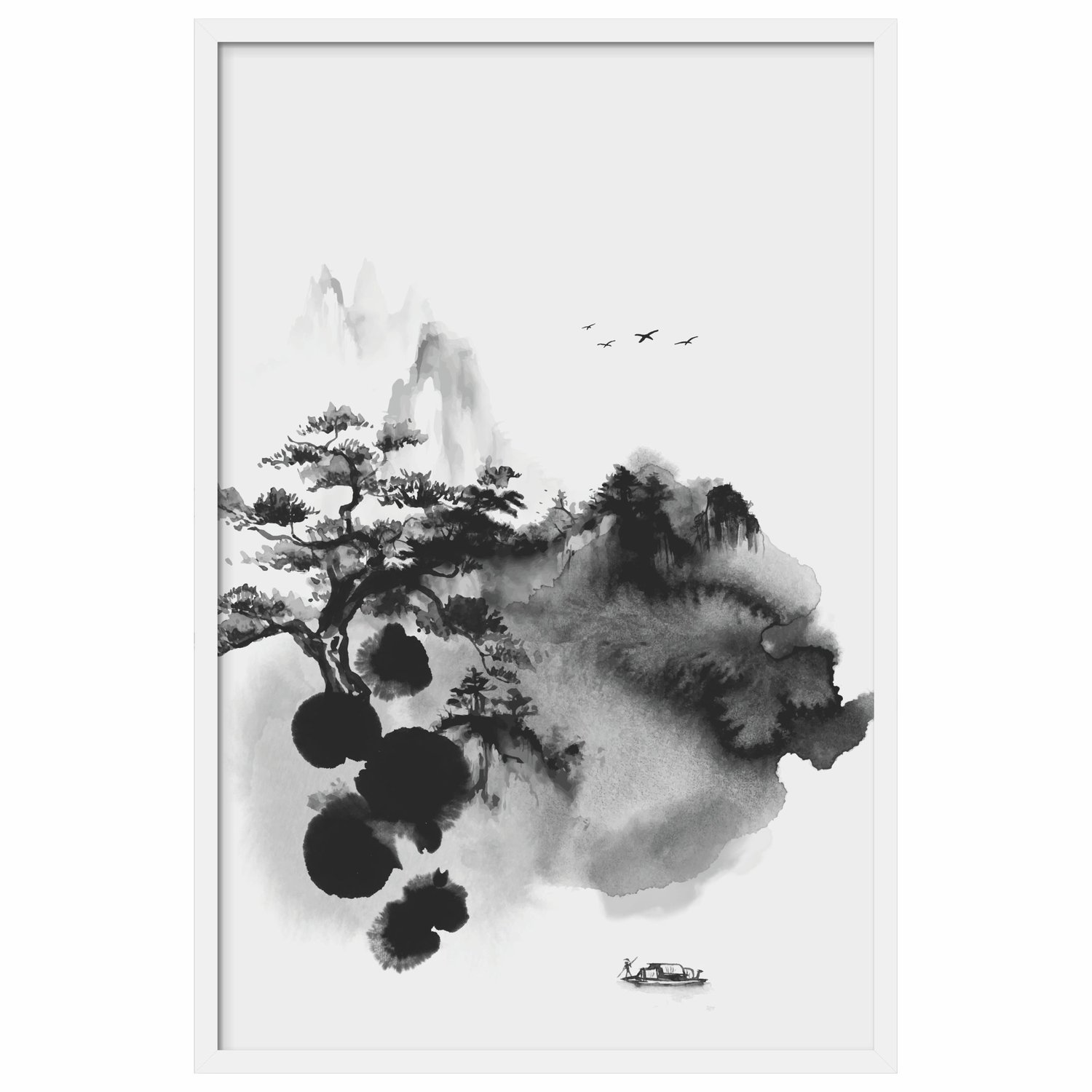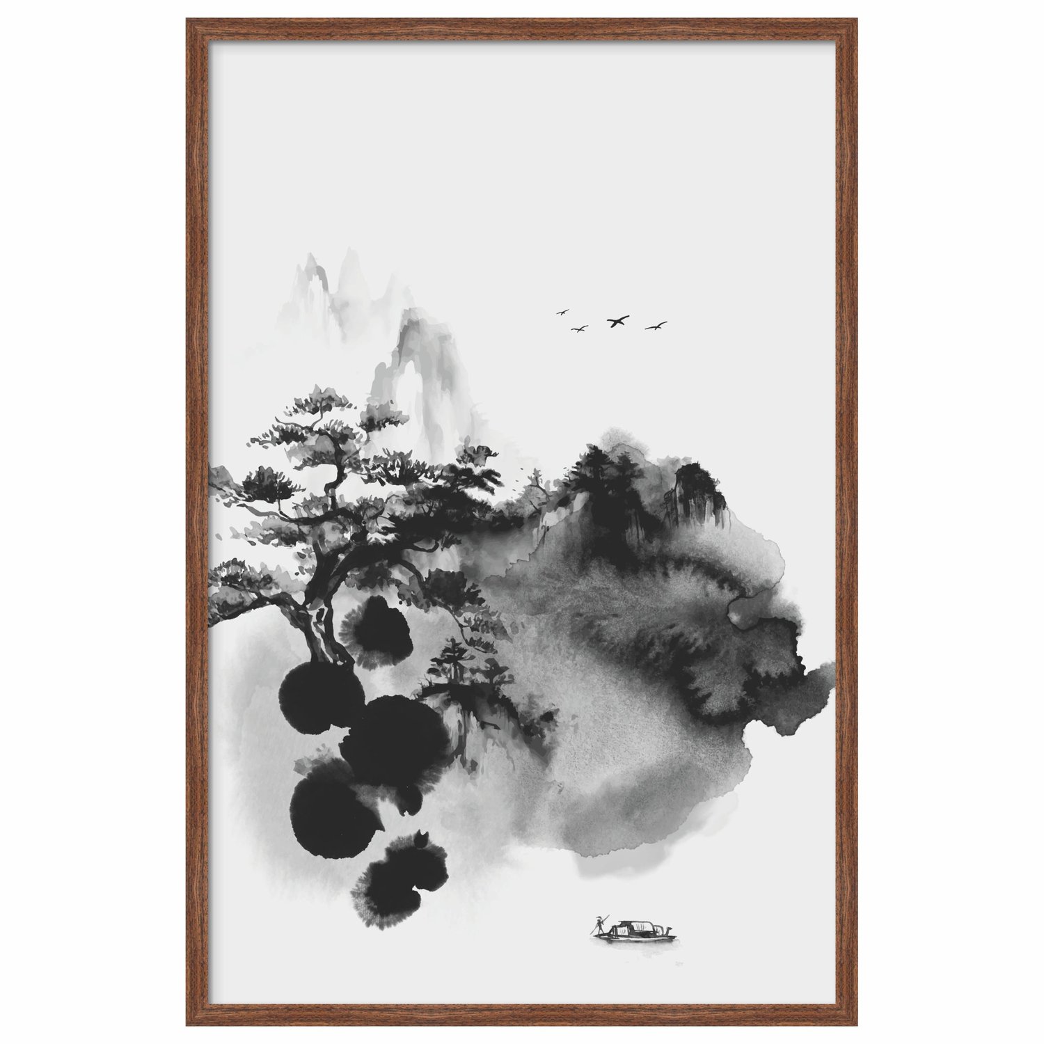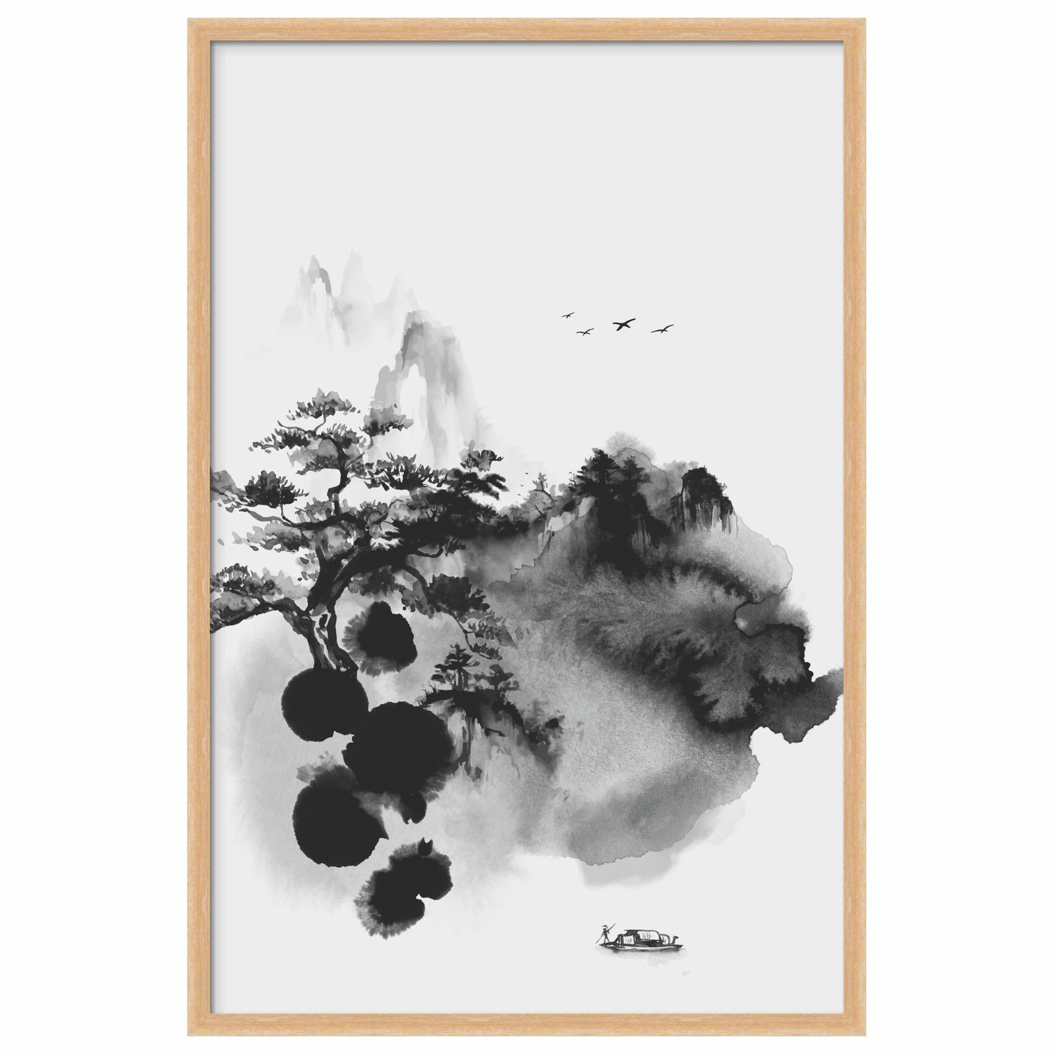 Quadro Decorativo Ki Yama Pintura de Árvore em Frente a Montanhas no Estilo Sumiê