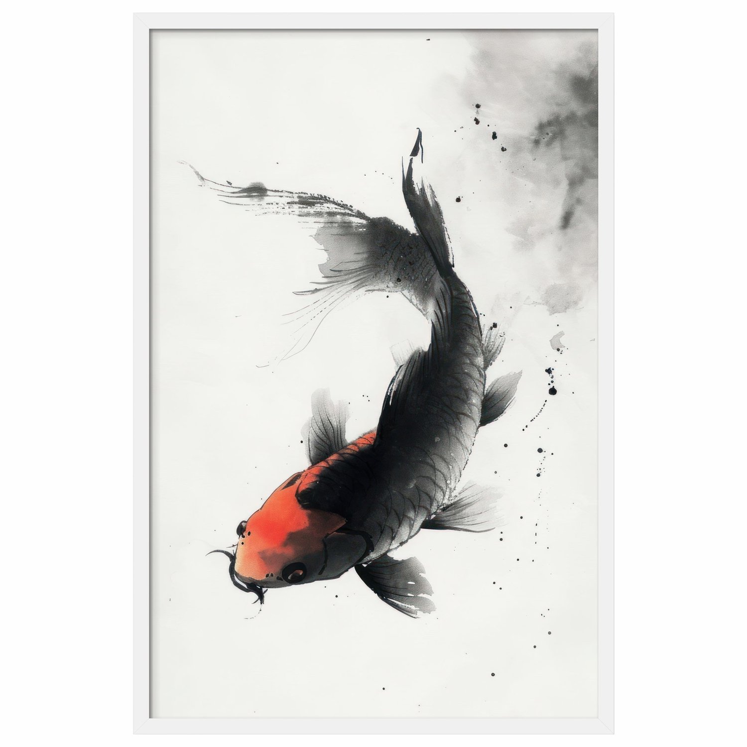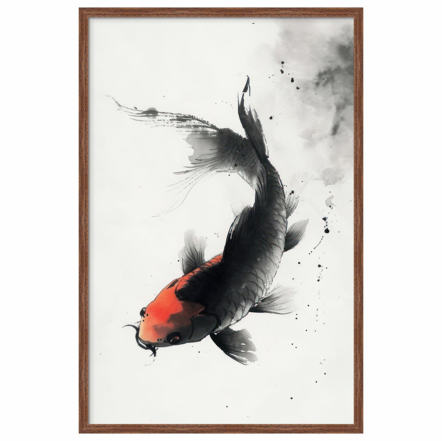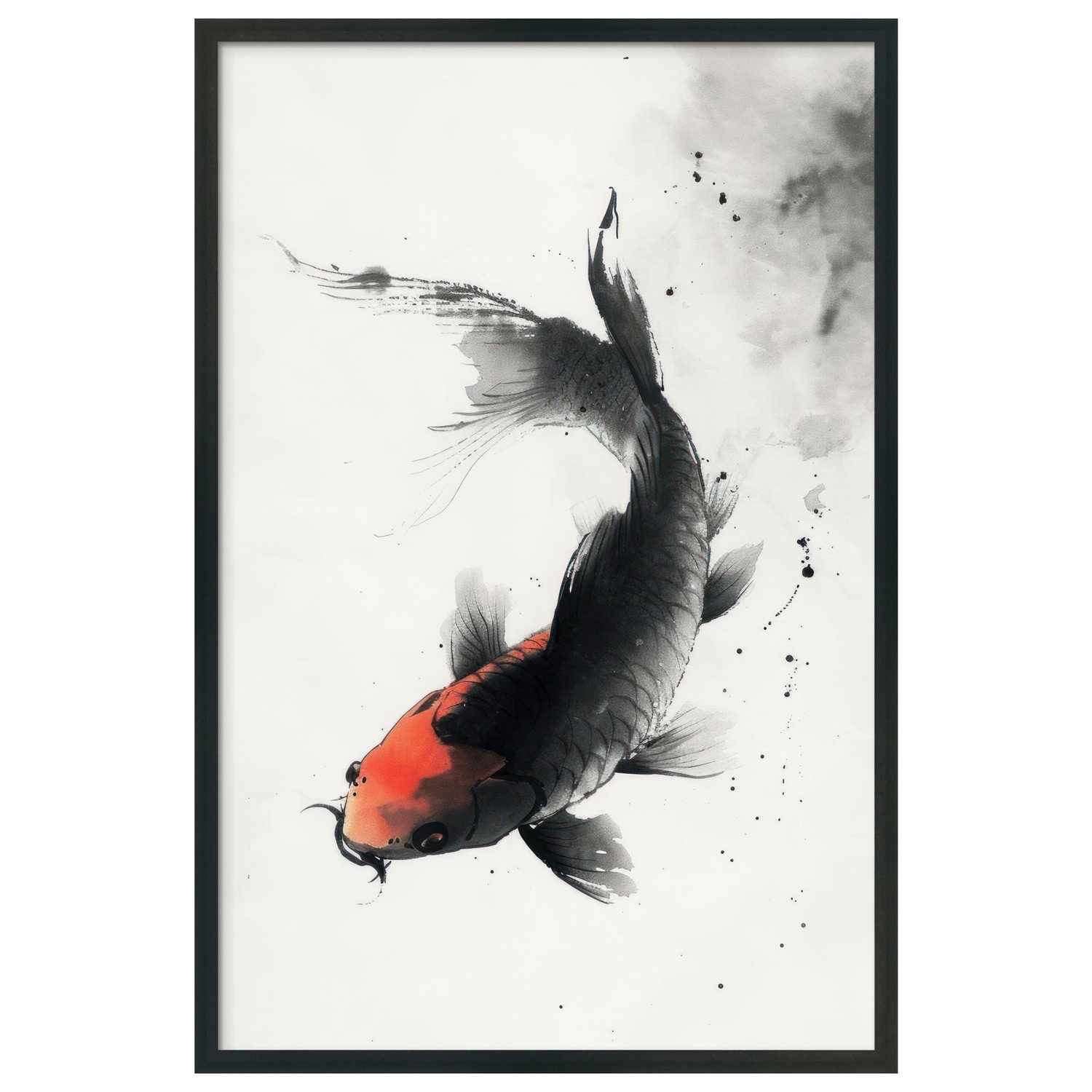 Quadro Decorativo Koi Pintura de Carpa Nishikigoi Preto no Estilo Sumiê
