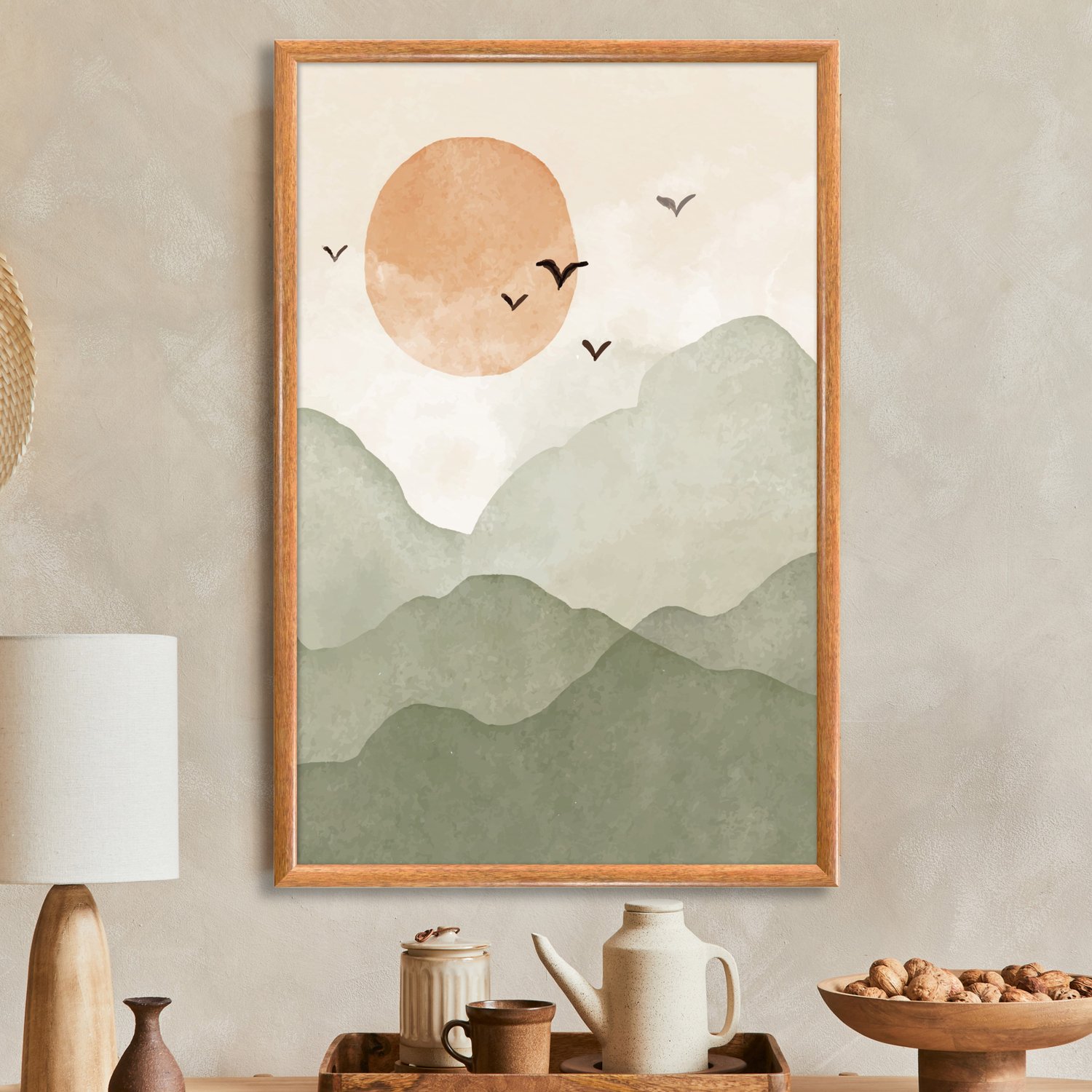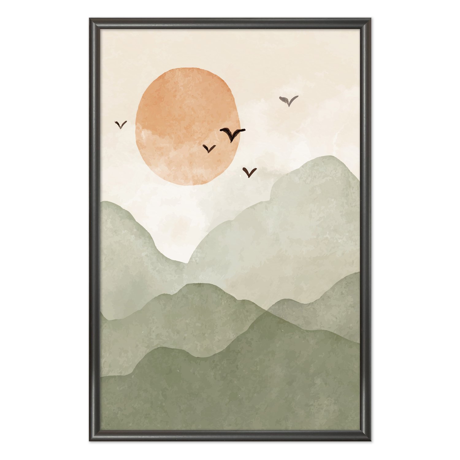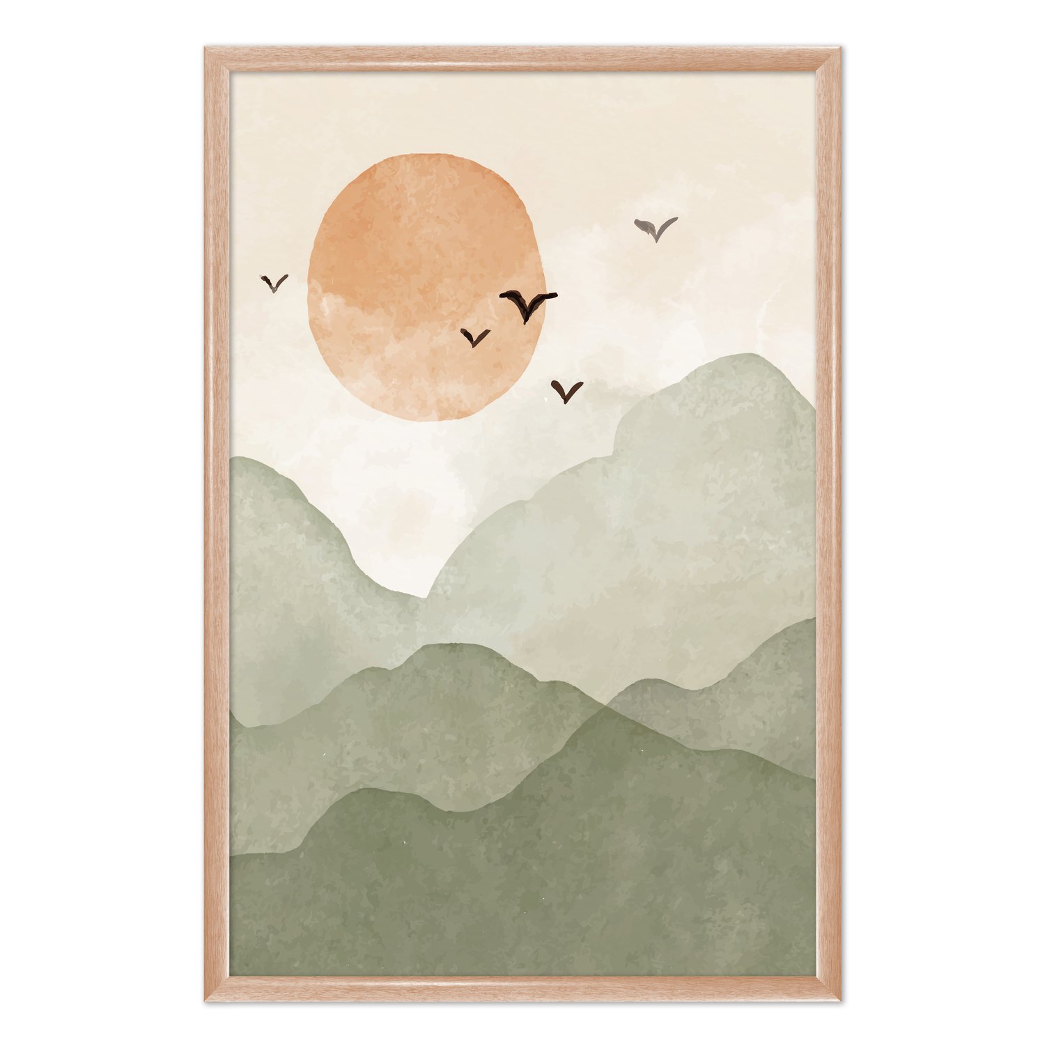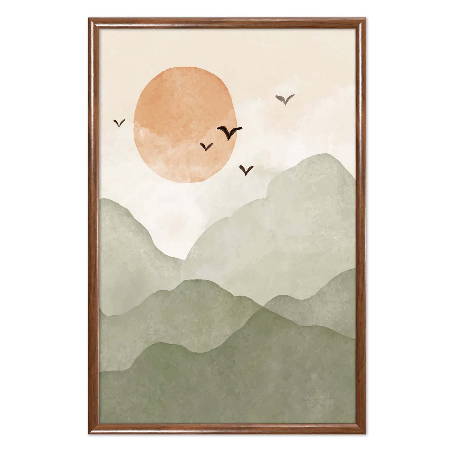 Quadro Decorativo Montanhas Com Sol E Pássaros Aquarela