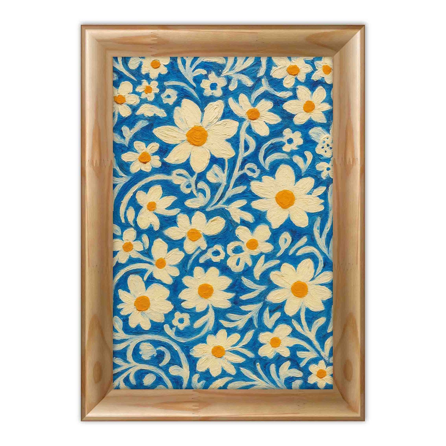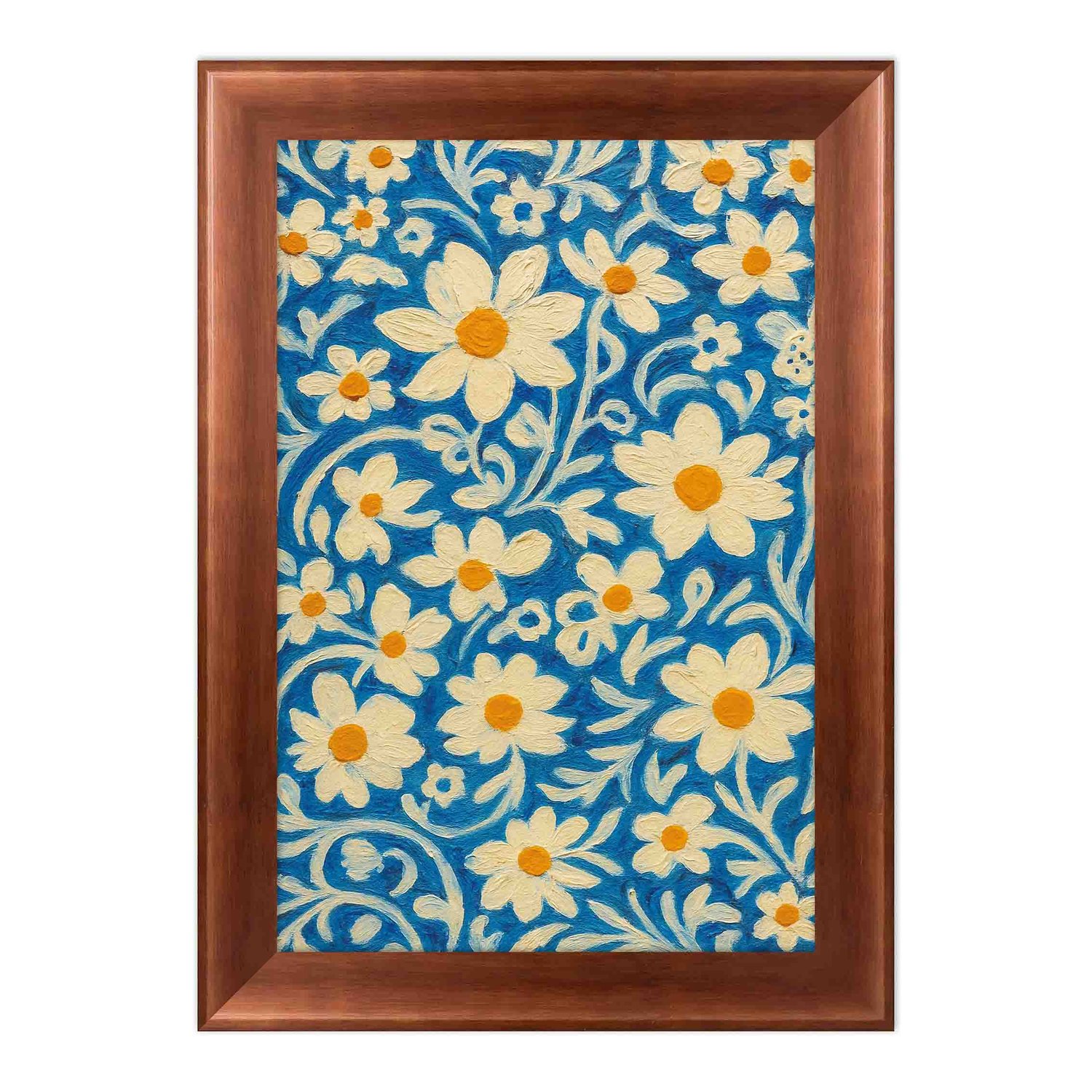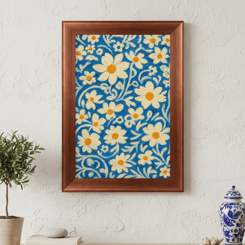 Quadro Decorativo Padrão Floral Estilizado: Margaridas Brancas e Amarelas em Fundo de Arabescos Azul-Cobalto