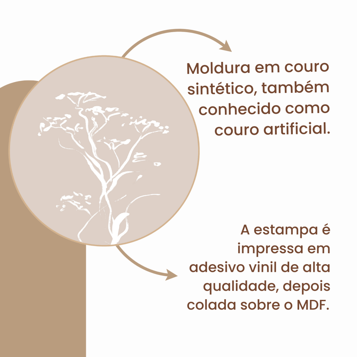 Moldura: Moldura em couro sintético, também conhecido como couro artificial, couro vegano ou couro falso, é um material que imita as características do couro natural, mas não é produzido a partir de materiais provenientes de animais, ou seja, é fabricado de diferentes materiais, como o poliuretano (PU) ou poliéster revestido com um composto de plástico, livre de produtos de origem animal!