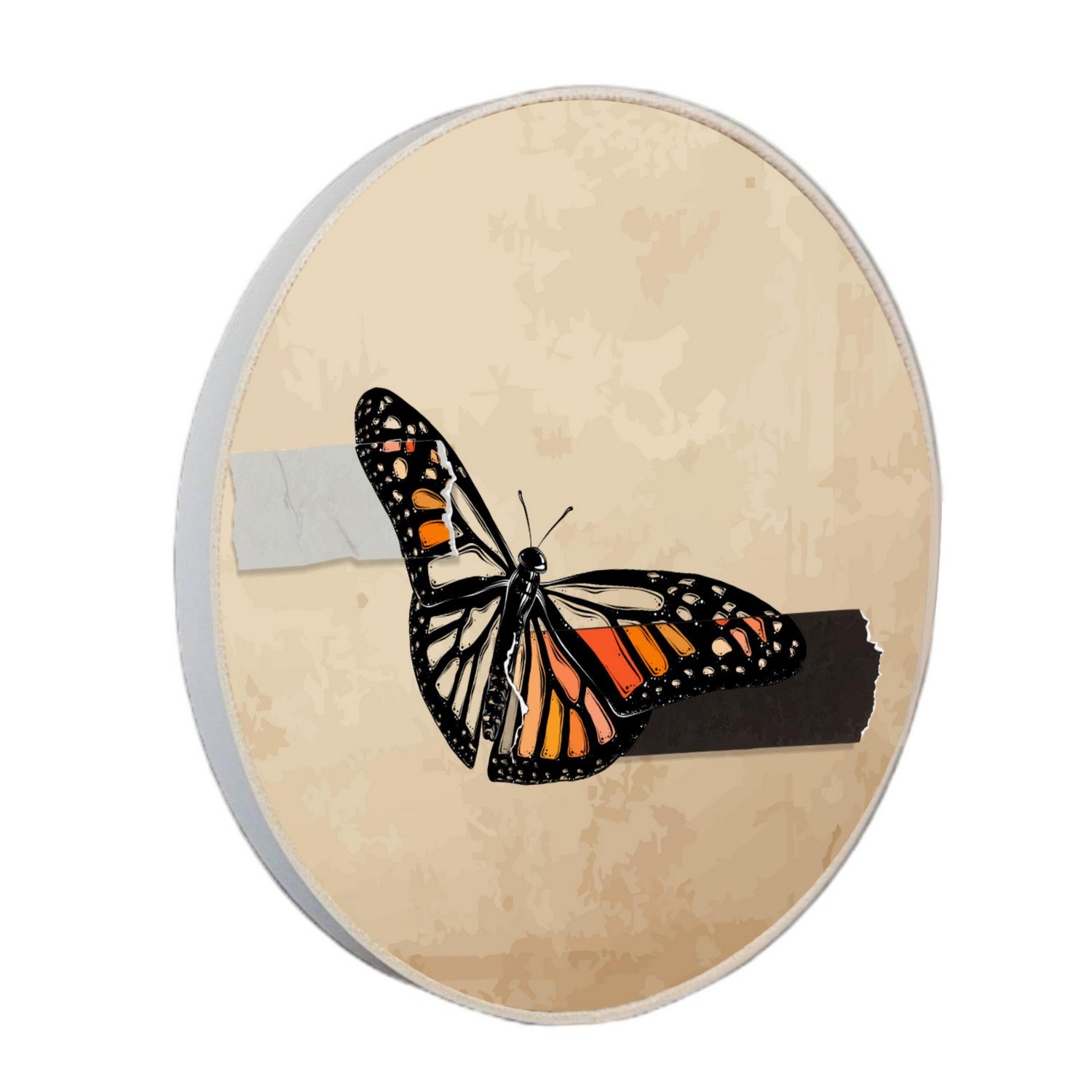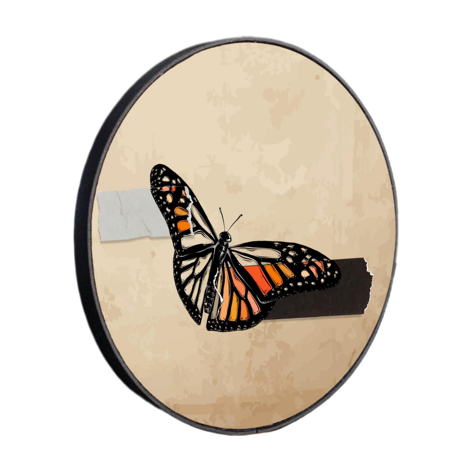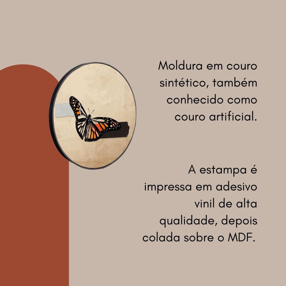 Quadro Decorativo Redondo Borboleta Fita Cinza e Preta com Moldura em Couro Sintético