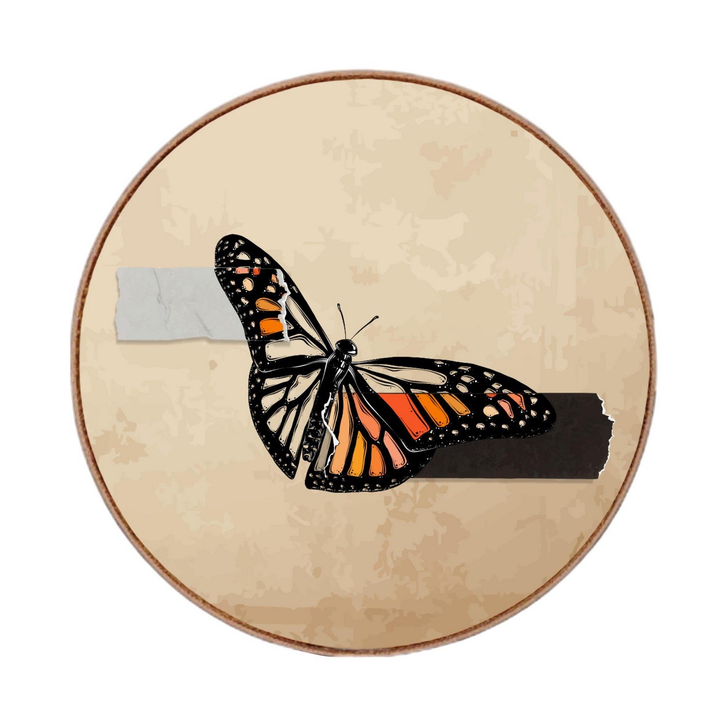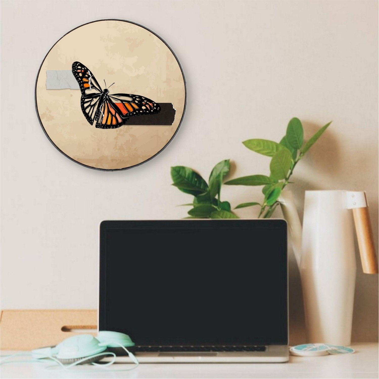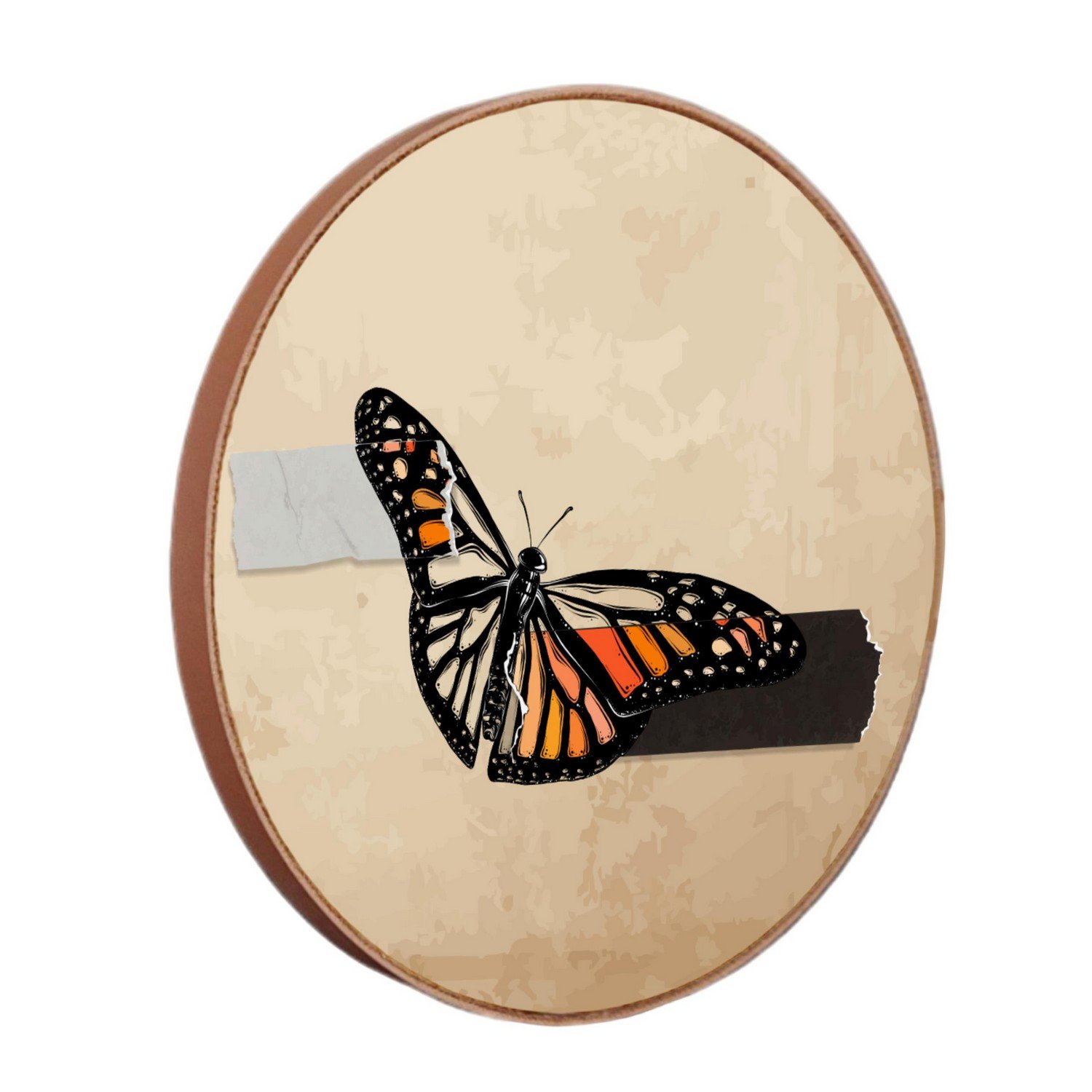 Quadro Decorativo Redondo Borboleta Fita Cinza e Preta com Moldura em Couro Sintético