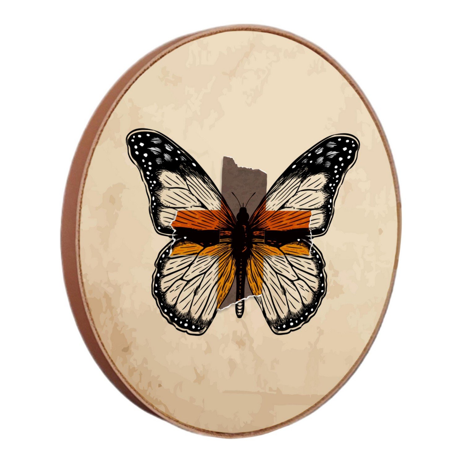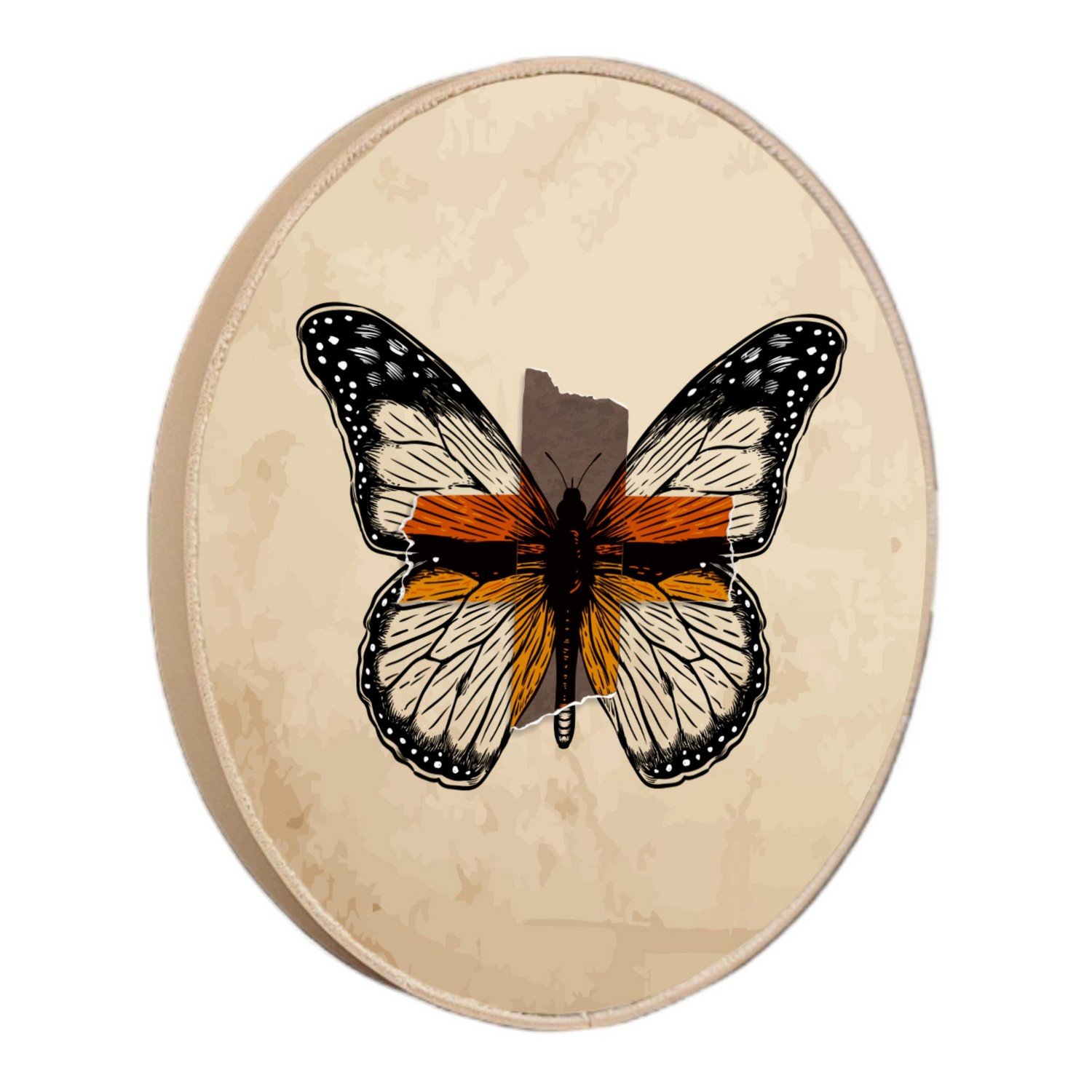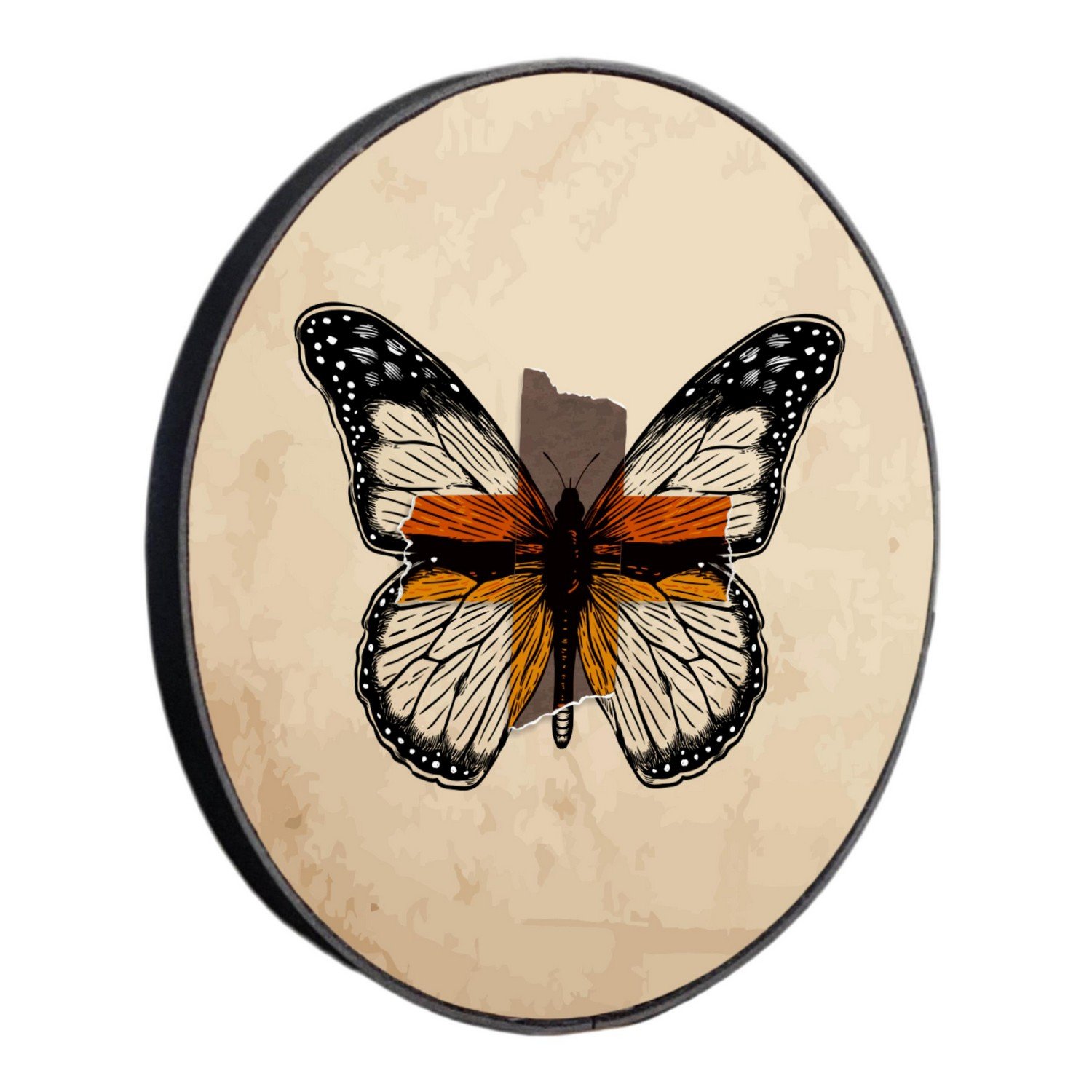 Quadro Decorativo Redondo Borboleta Fitas com Moldura em Couro Sintético