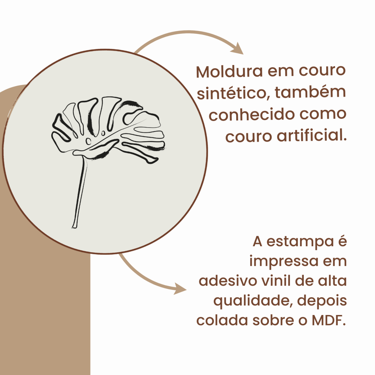 Moldura: Moldura em couro sintético, também conhecido como couro artificial, couro vegano ou couro falso, é um material que imita as características do couro natural, mas não é produzido a partir de materiais provenientes de animais, ou seja, é fabricado de diferentes materiais, como o poliuretano (PU) ou poliéster revestido com um composto de plástico, livre de produtos de origem animal!