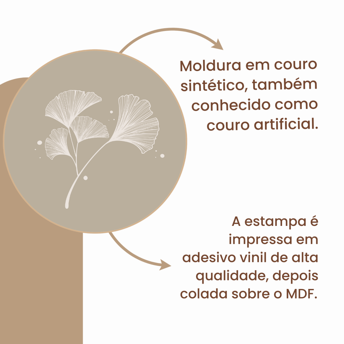 Moldura: Moldura em couro sintético, também conhecido como couro artificial, couro vegano ou couro falso, é um material que imita as características do couro natural, mas não é produzido a partir de materiais provenientes de animais, ou seja, é fabricado de diferentes materiais, como o poliuretano (PU) ou poliéster revestido com um composto de plástico, livre de produtos de origem animal!
