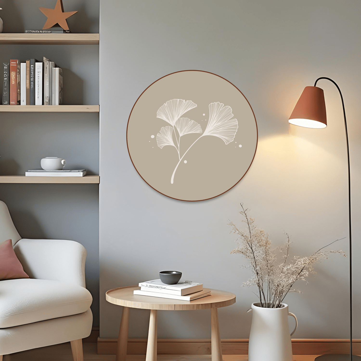 Quadro Decorativo Redondo Folha Ginkgo Biloba Com Moldura Em Couro Sintético
