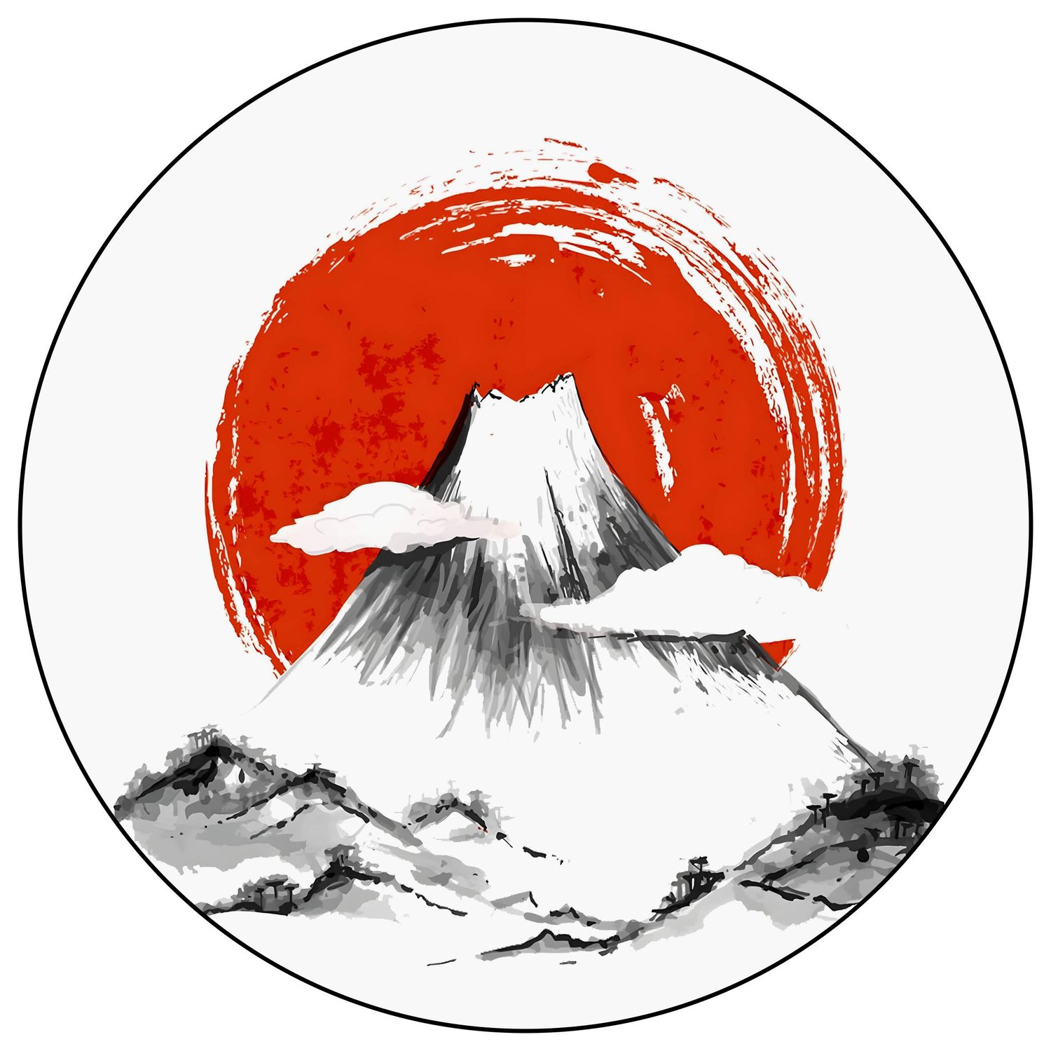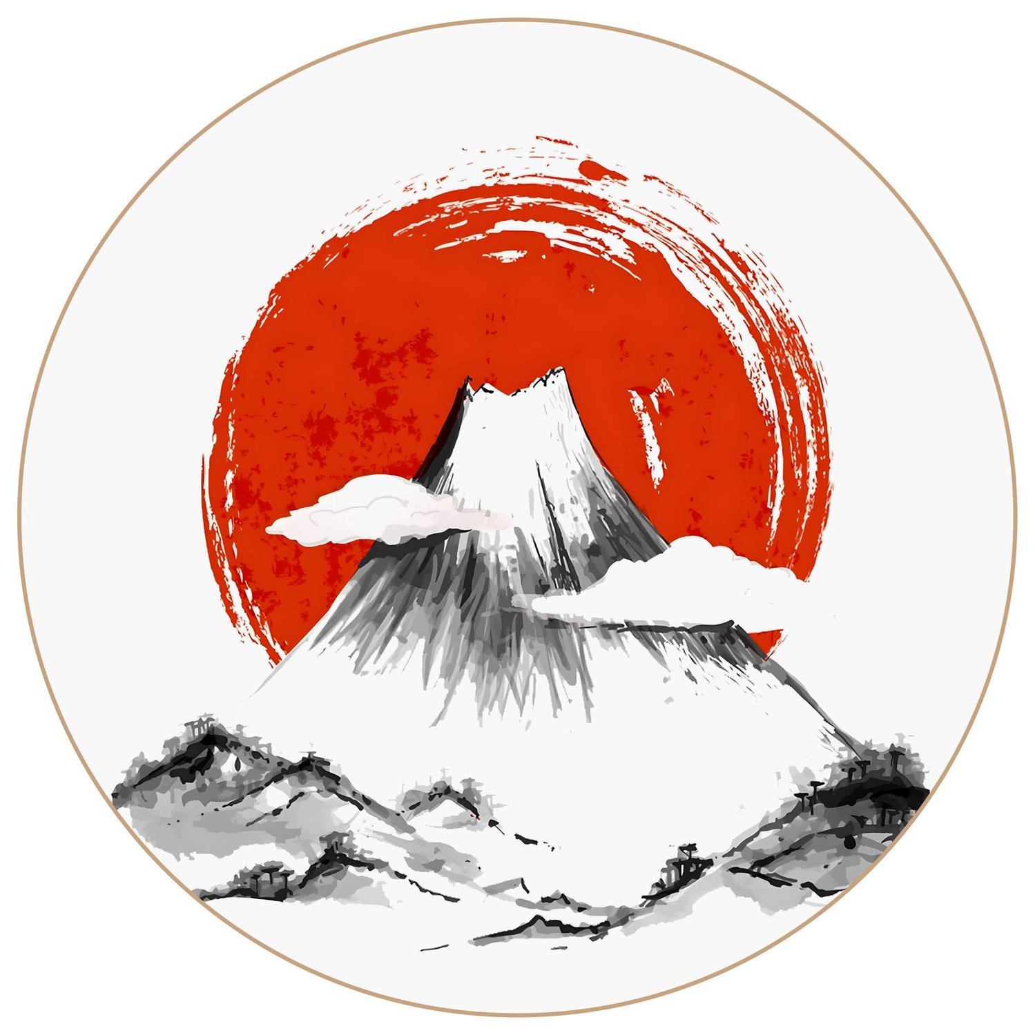 Quadro Decorativo Redondo Fujisan Taiyo Pintura do Monte Fuji em Frente ao Sol no Estilo Sumiê com Moldura em Couro Sintético