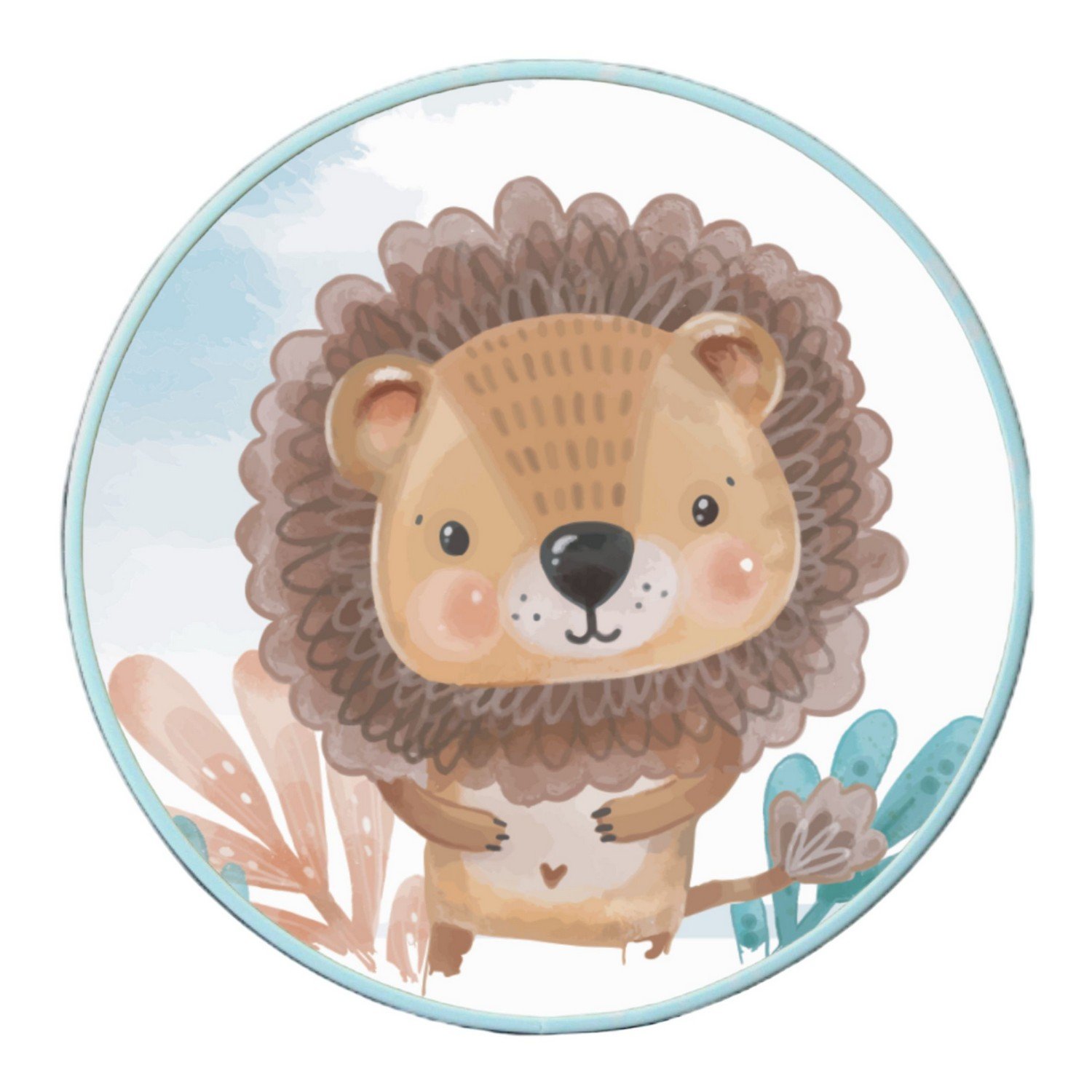Quadro Decorativo Redondo Infantil Leão Fofinho com Moldura Filete Flexível
